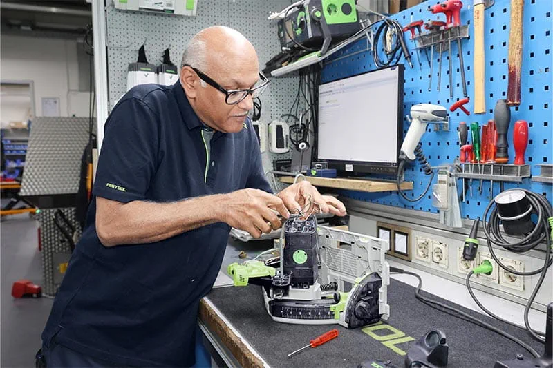 Ganz egal, ob eine brandneue Maschine vom hohen Gerüst gefallen ist oder ein „historisches“ Festool Werkzeug etwas mehr Zuwendung braucht – in allen Fällen gilt: Wir haben das Werkzeug entwickelt. Wir haben es produziert. Wir wissen am besten, wie man es repariert. Dabei wird nicht einfach nur ein Defekt behoben. Die Werkzeuge werden umfassend analysiert, justiert und eingestellt, in den allermeisten Fällen wird die Maschine sogar intensiv gereinigt. Auf die reparierten oder ausgetauschten Ersatzteile gibt es von Festool eine zwölfmonatige Garantie. Das ist ein Mehrwert, der nicht nur die Maschine, sondern auch die Kunden glücklich macht.