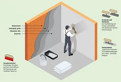 - Je nach gewünschter Oberflächengüte können für Unterputz (grob) und Oberputz (fein) unterschiedliche Materialqualitäten und Körnungen verwendet werden.