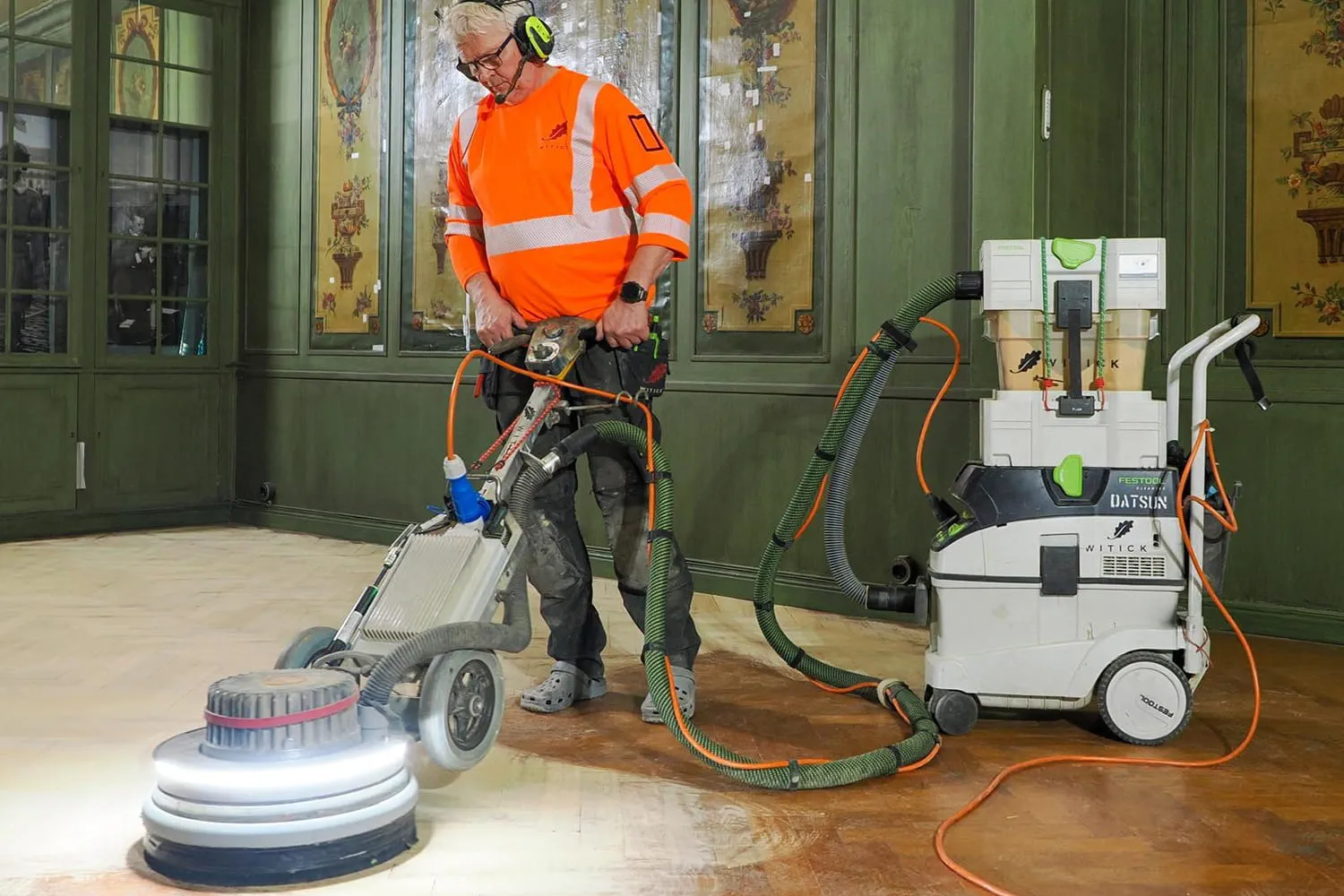 Diese Kombination aus effektiver Staubabsaugung und Luftreinigung ermöglichte es, die anspruchsvollen Sanierungsarbeiten wertschätzend durchzuführen - auf eine Art und Weise, die den höchsten Standards der Arbeitswelt entspricht, sowohl in der Vergangenheit als auch heute.Veredelung einer wertvollen Umgebung - Ölen mit dem ETSC 2-Schleifer