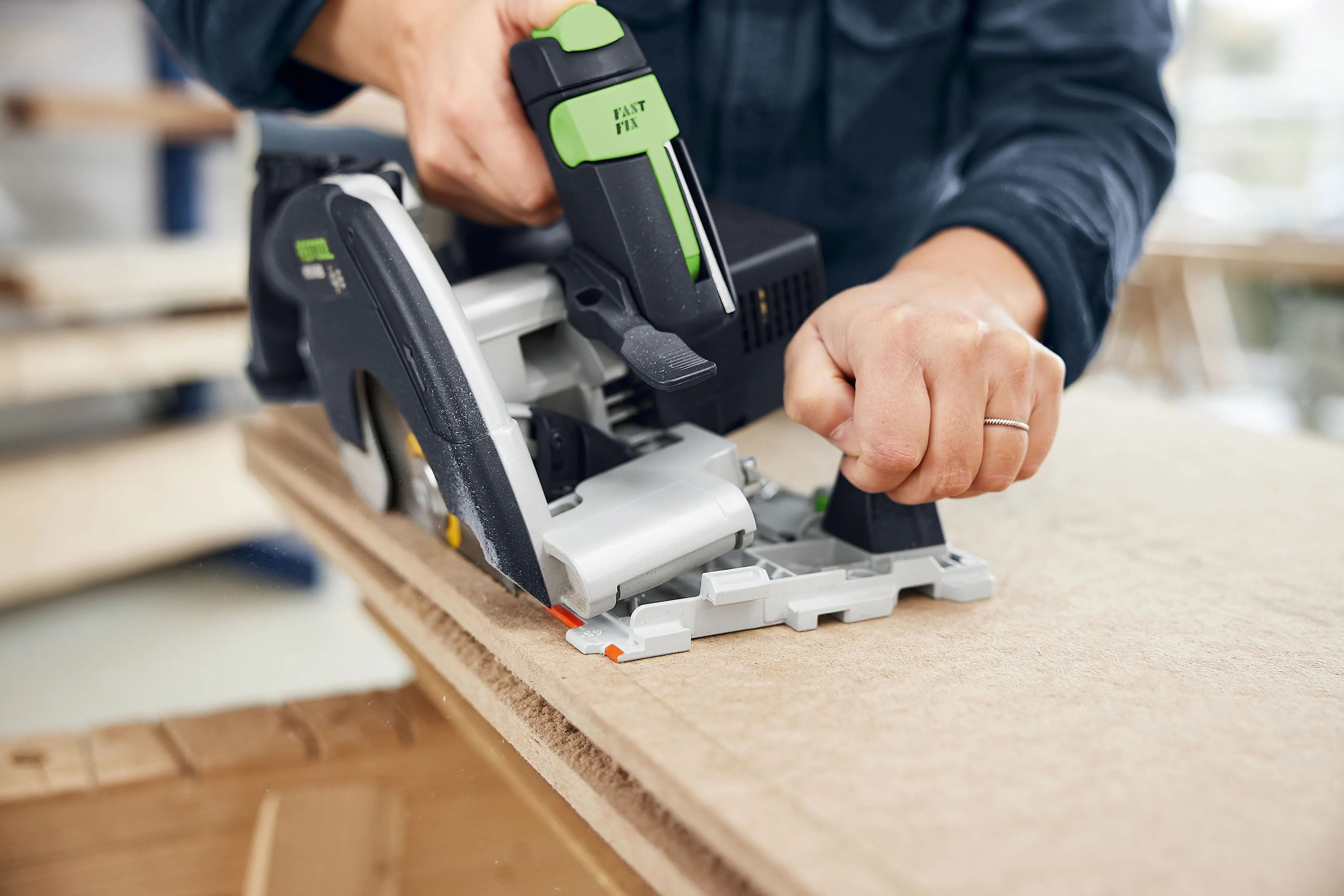 Wendigkeit, Präzision und Sicherheit – mit der neuen HKC 55 K setzt Festool neue Maßstäbe im Bereich mobiler Akku-Handkreissägen. Der deutsche Hersteller hat die leistungsstarke Säge speziell für professionelle Handwerker entwickelt, die auf der Baustelle oder in der Werkstatt auch bei mobilen Kappschnitten keine Kompromisse mehr eingehen wollen. Mit innovativen Funktionen, einem kraftvollen 8,0 Ah Akkupack und perfekt abgestimmten Systemkomponenten bietet die HKC 55 K alles, was für effizientes und sicheres Arbeiten erforderlich ist.