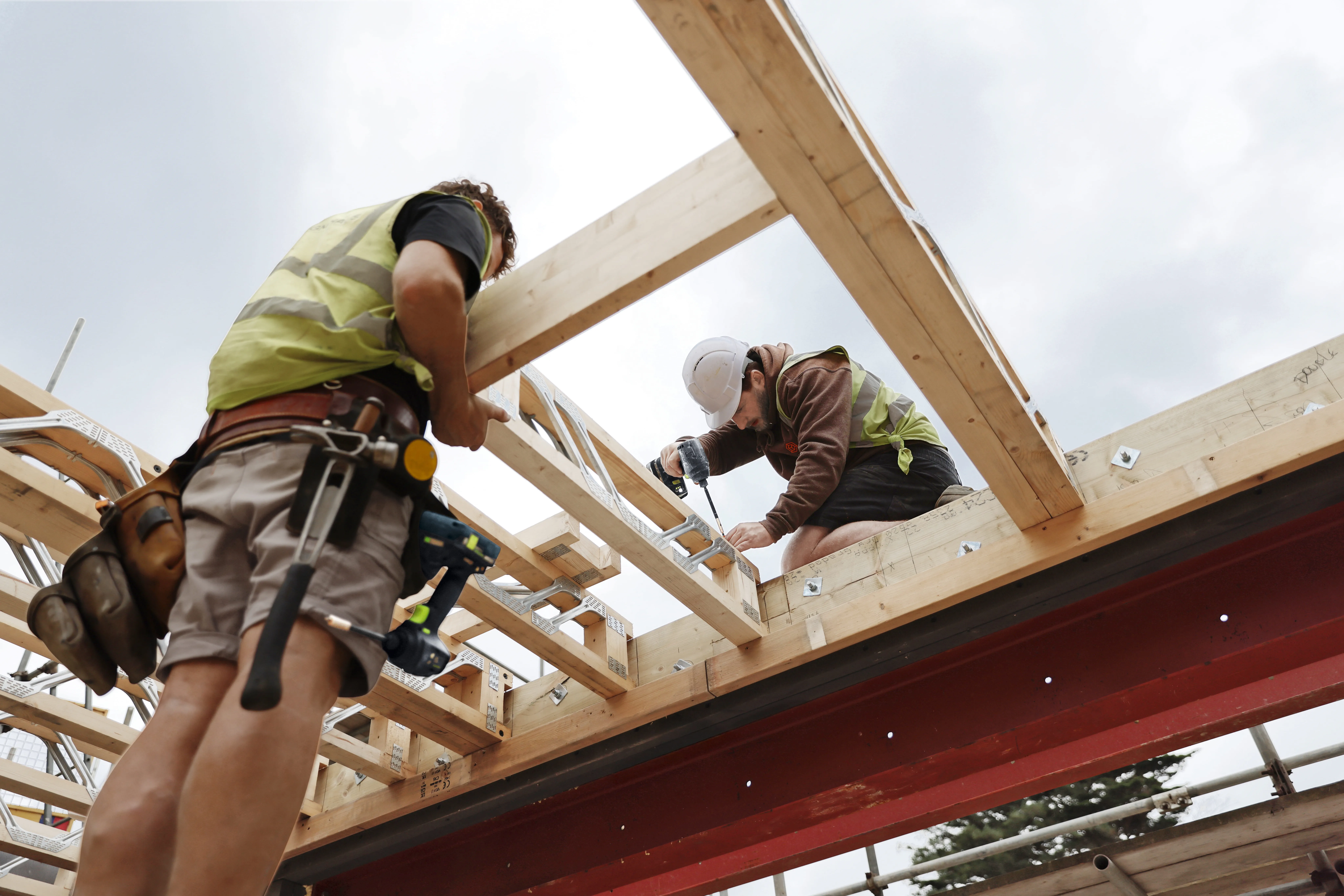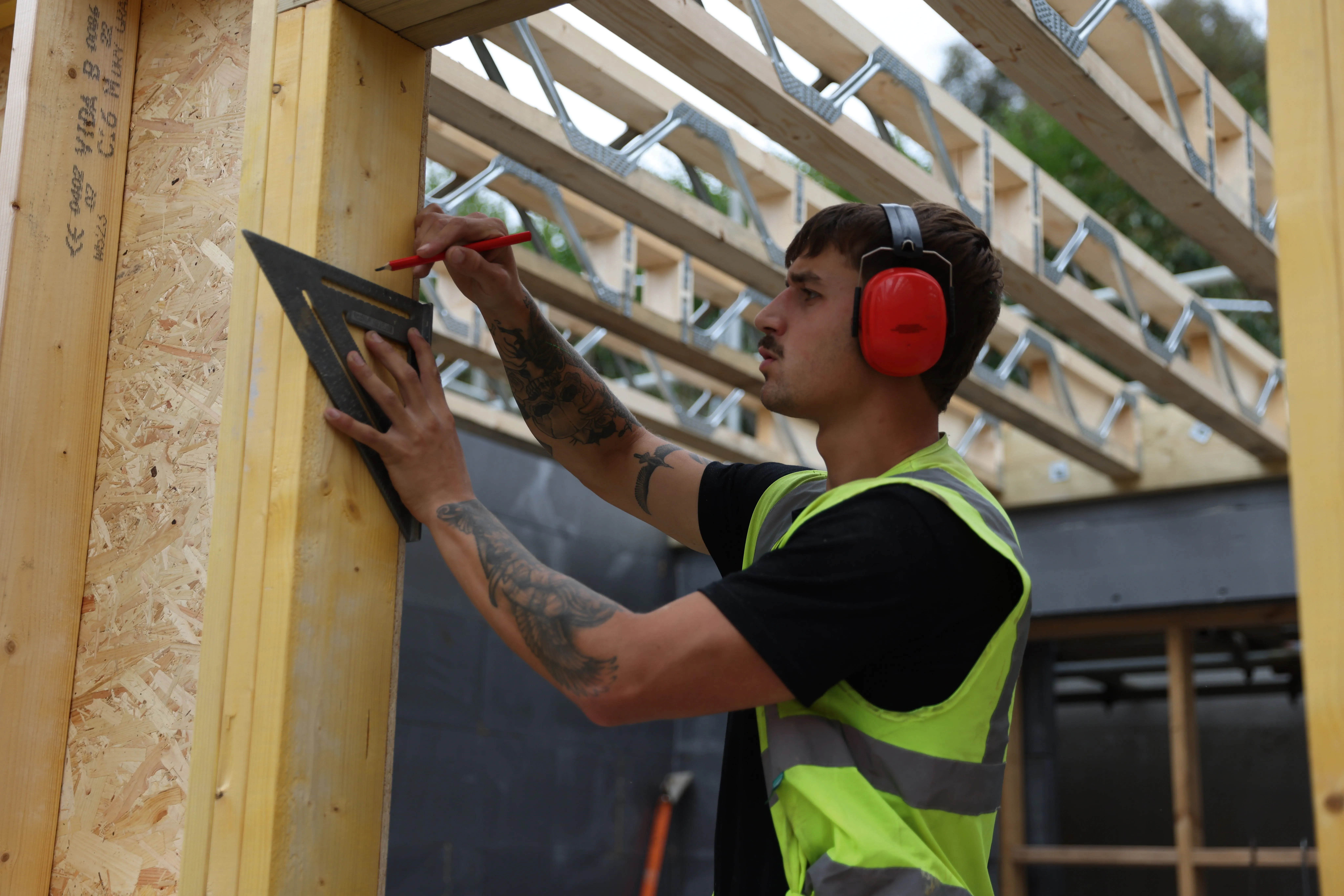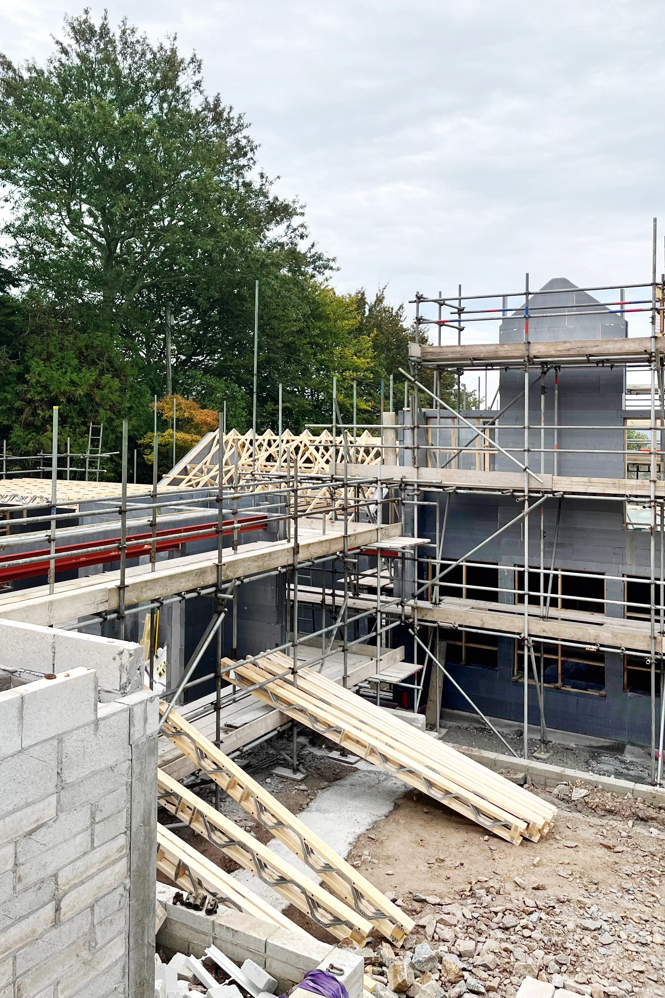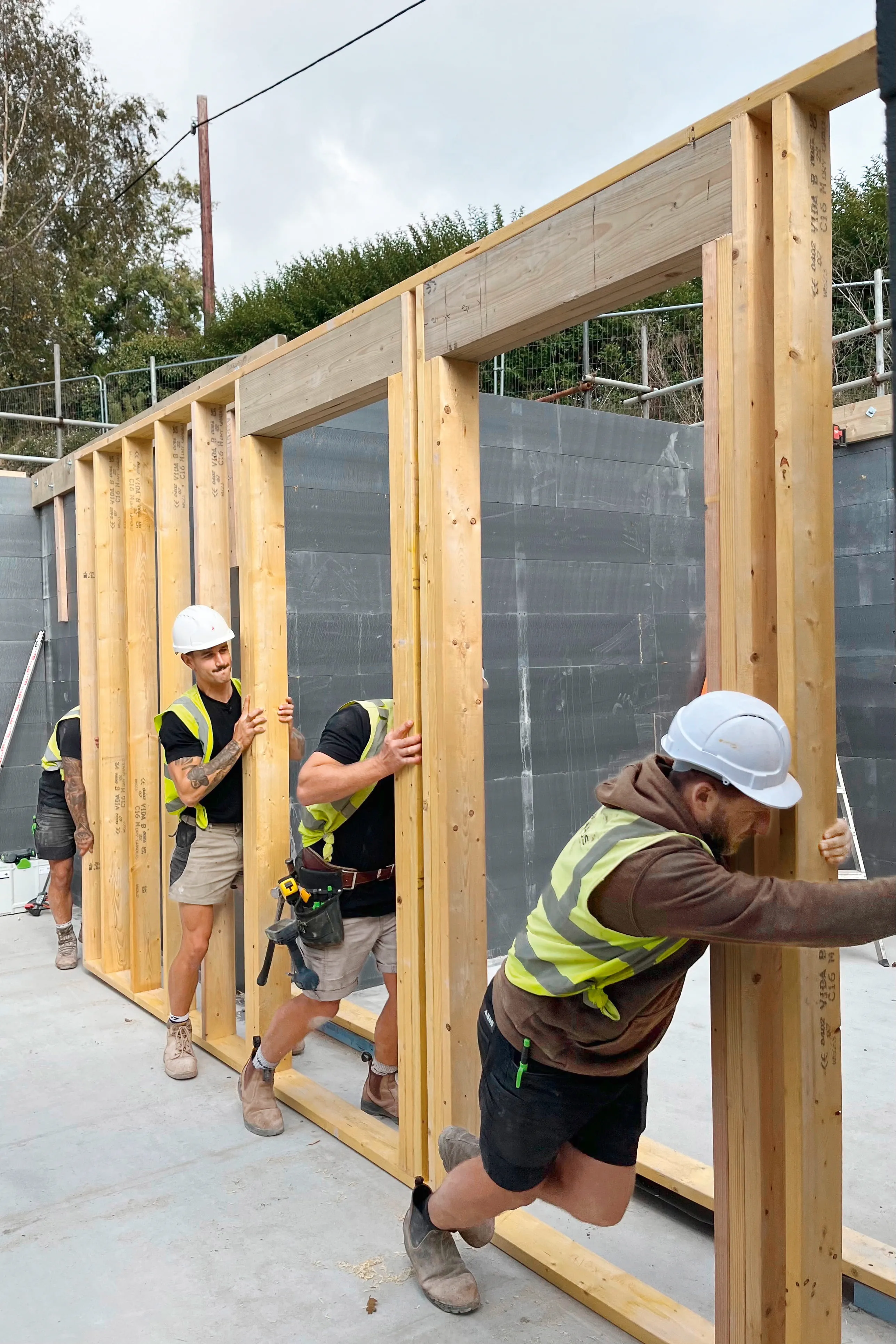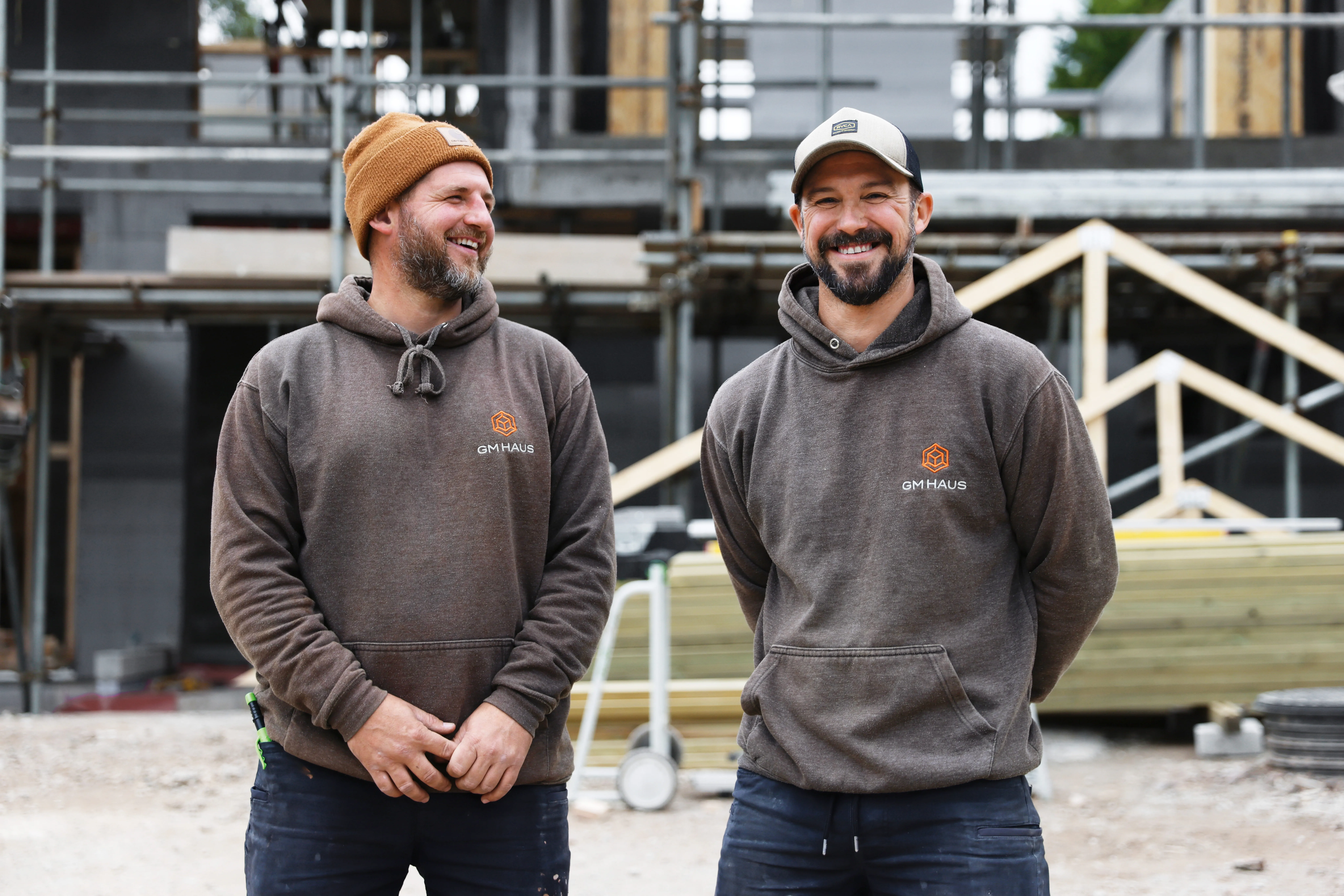 Das Projekt: Ein zweigeschossiges Einfamilienhaus – modern, energieeffizient, mit viel Holz. Seit Februar 2025 sind Sam und Nathan mit ihrem Team fast jeden Tag vor Ort. Die Firma GM Haus, die sie vor fünf Jahren gründeten, übernimmt hier als „General Builder“ tatsächlich den gesamten Bauauarag mit allen Gewerken: vom Abriss des alten Hauses, über Rohbauarbeiten, Errichtung tragender Holzkonstrukconen bis hin zum Finish im Innenausbau. Alles anspruchsvoll und herausfordernd. Aber das ist genau das, was die beiden lieben und was sie von Anfang an wollten.