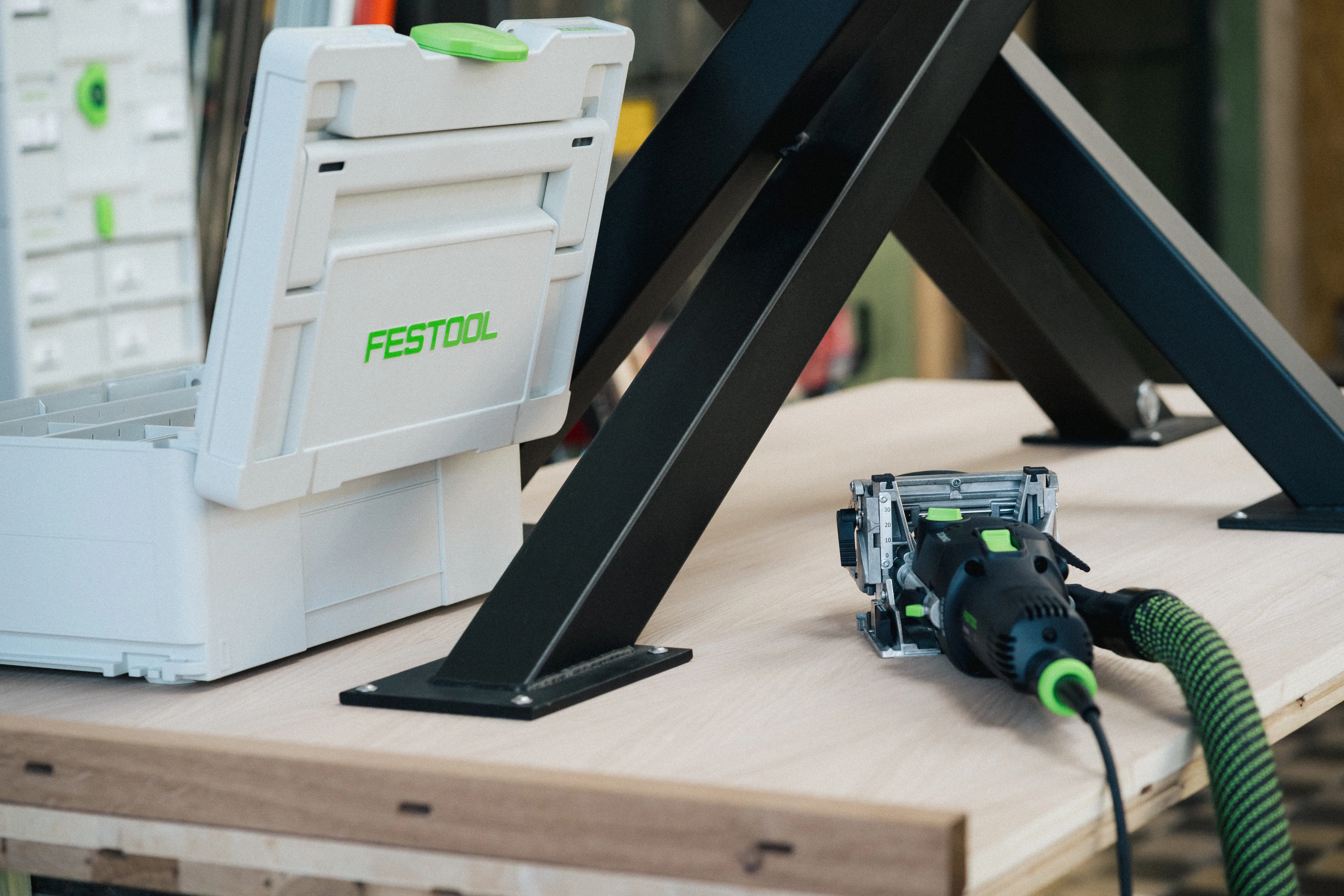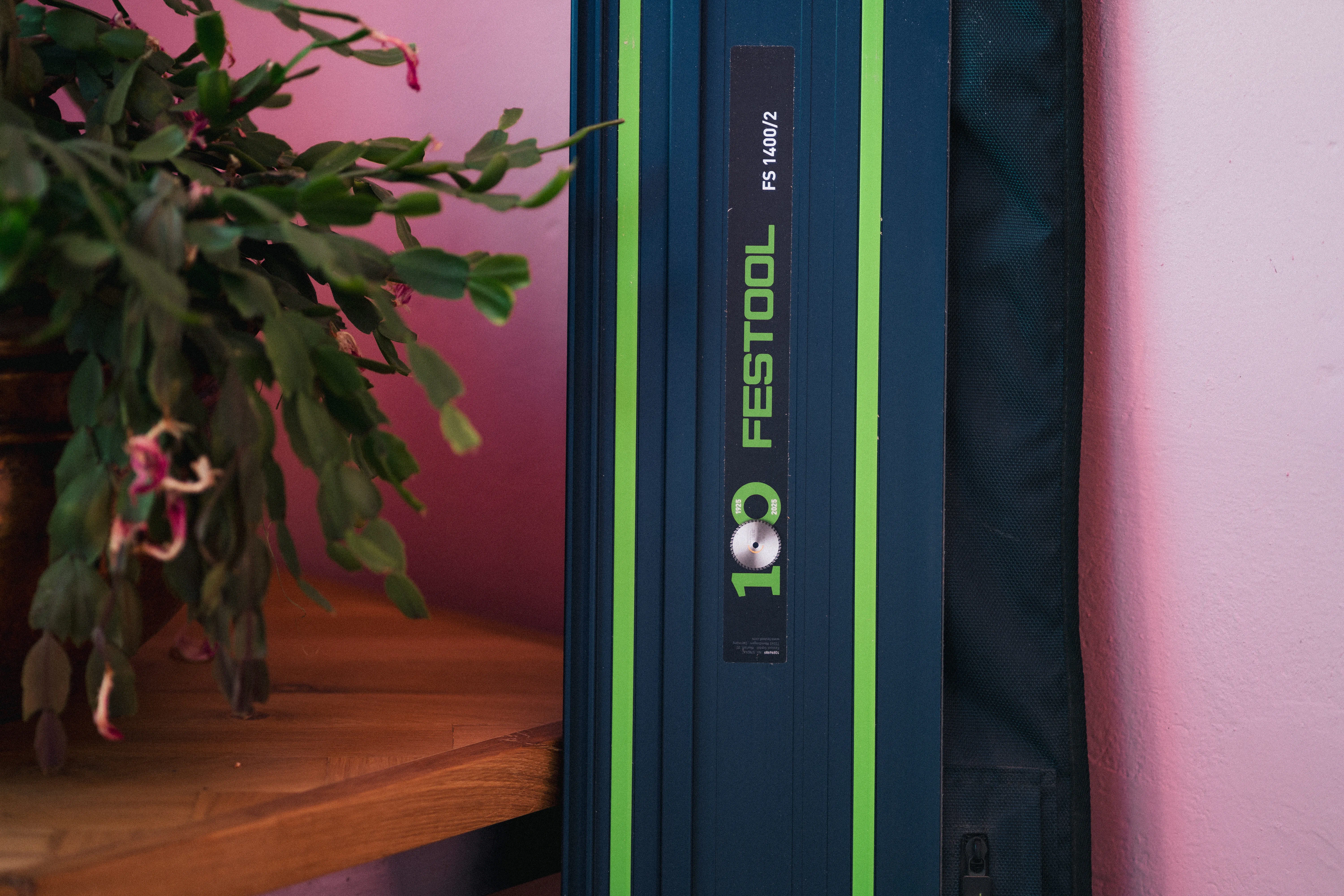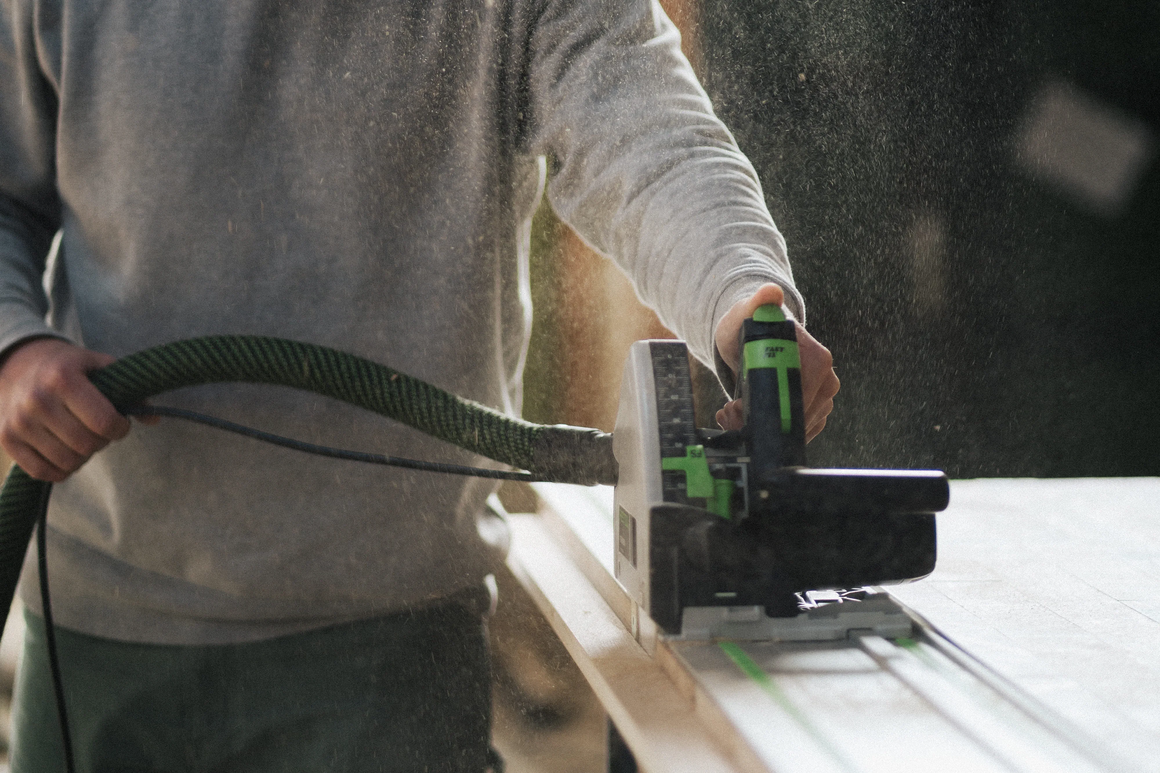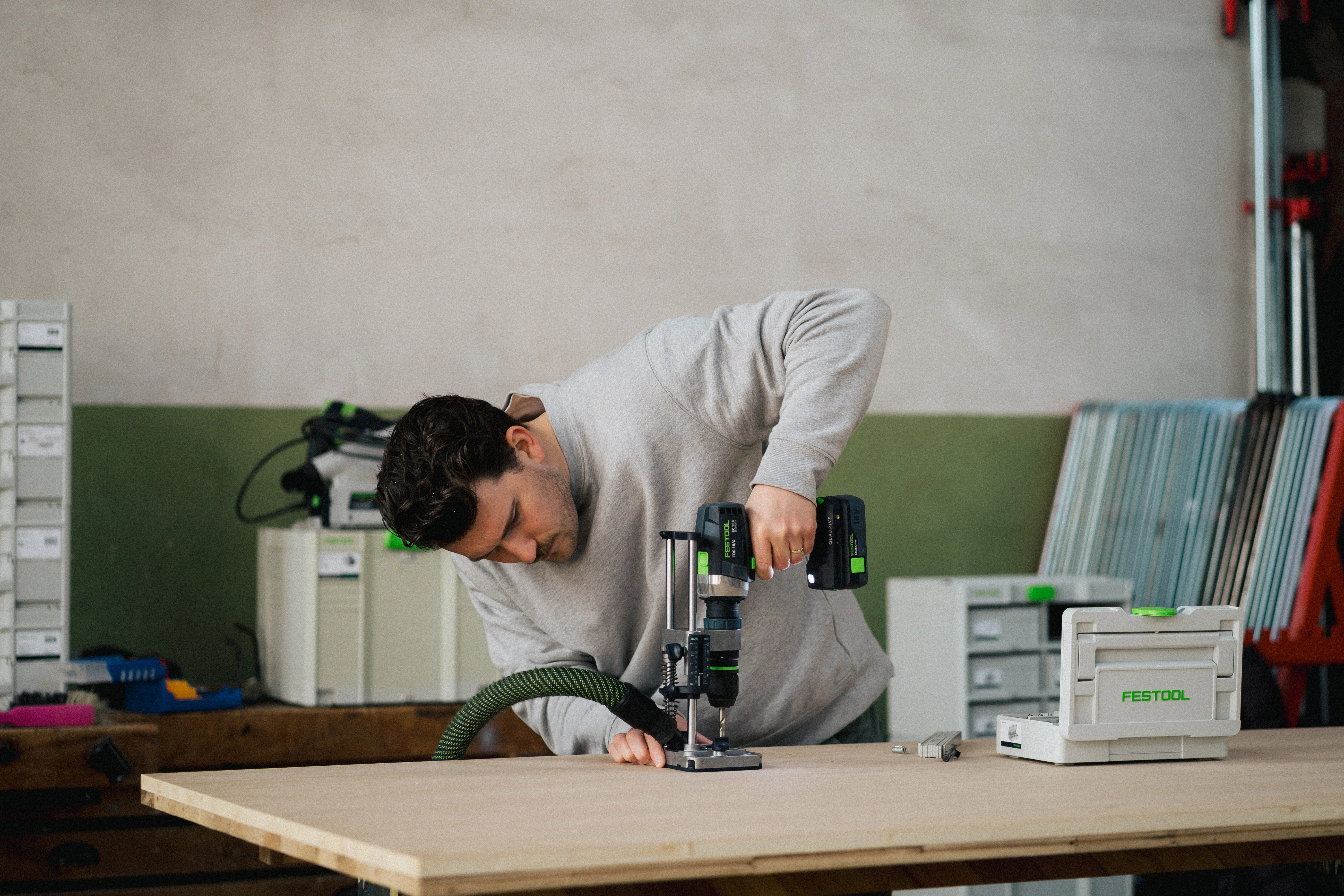 Bei mir findet man tatsächlich auch nur Werkzeug von Festool, von Exzenterschleifer über Tauchsäge und Akkuschrauber bis hin zu den Oberfräsen. Ich finde es einfach schön, dass das alles ein System ist und die Tools auch sinnvoll und wertig sind, deswegen wurde das Geld am Anfang immer direkt in neue Maschinen investiert und ich bereue es nicht, denn es macht einfach Sinn. Wir arbeiten jetzt zu dritt hier, wir haben vernünftiges Werkzeug und es geht nichts kaputt, das wird auch wertgeschätzt. Mir war es von Anfang an sehr wichtig, dass wir mit qualitativ hochwertigem Werkzeug arbeiten können und da ist Festool einfach unschlagbar.