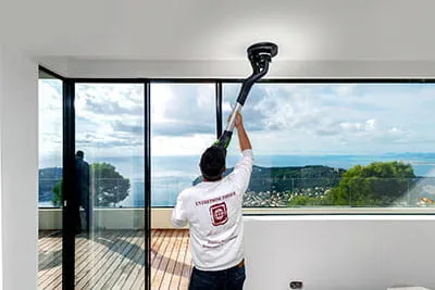 Wir fahren rund zwanzig Autominuten in einen Nachbarort von Nizza, nach Villefranche-sur-Mer. Schon während der Fahrt blitzt immer wieder das Mittelmeer durchs Beifahrerfenster. Als wir auf der Baustelle ankommen, liegt es uns buchstäblich zu Füßen. Kaum vorstellbar, dass man hier oben arbeiten kann, ohne sich von dem grandiosen Ausblick ablenken zu lassen. Die „Villa La Cascade“ liegt treppenförmig am Südhang. Das Bauprojekt umfasst Renovierungsarbeiten im Bestand und eine Neubauerweiterung. Alle Malerarbeiten werden im höchsten Standard ausgeführt. Das betrifft die Vorbereitung der Untergründe genauso wie die Veredelung mit spezifischen Farben, Dekorationsmaterialien und hochwertigen Tapeten.