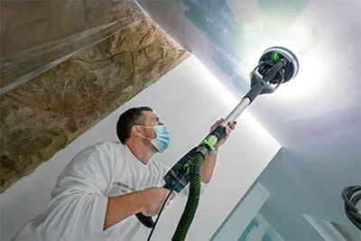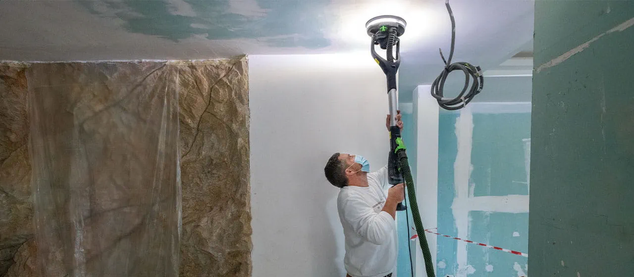 Das Team von Didier zaubert eine exklusive Schilfrohr-Dekoration an die Wand. Im Erweiterungsbau werden drei Säulen mit einem Marmorimitat versehen – dazu braucht es einen perfekt vorbereiteten Untergrund, der dann lackiert und poliert wird. „Für uns sind perfekte Werkzeuge, die optimal auf unsere Bedürfnisse abgestimmt sind, das Allerwichtigste“, betont Didier Lebon. Er hat sich für seinen Betrieb eine spezielle Glättkelle anfertigen lassen. Besonders hochwertige Oberflächen werden mit Festool Schleifgeräten und Schleifmitteln bis zu einer Körnung von 4.000 ausgeführt.