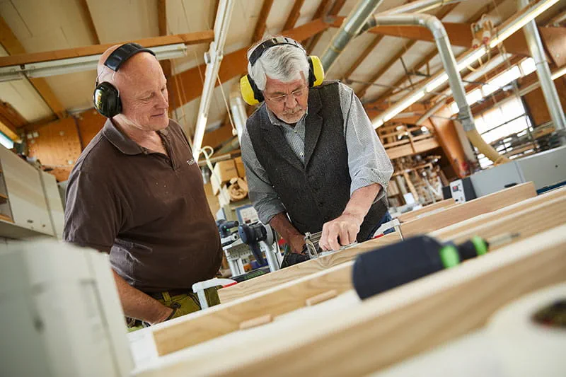 Der Tischler Schillings und Möllmann verbinden mithilfe der Domino Verbindungsdübel von Festool die Einzelteile des Schaukelstuhls.