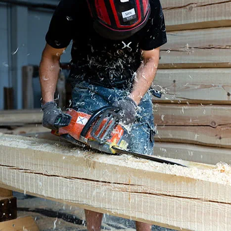 „Der Bau einer Rauchsauna ist Teamwork, weil ein hoher Anteil an Handarbeit gefragt ist. Jeder Mitarbeiter hat bei uns seine Rolle und am Ende spielt alles zusammen. Pro Jahr bauen wir fünf bis zehn Saunas“, erzählt uns Johannes stolz. Dann geht er zusammen mit seinem Bruder Ilkka ans Werk: Zunächst werden die Balken mit einer Motorsäge in Länge und Breite zugesägt. Dabei werden auch Auskerbungen in die Balken gesägt, damit nachher alles ohne Spiel eingepasst werden kann. Schon beim Zuschauen wird klar: Das passgenaue Zusägen erfordert Erfahrung und Feingefühl. Zur gleichen Zeit werden mit einem Ziehmesser die Holzbretter entrindet, die später als Sitzbänke zum Einsatz kommen, und mit dem Hobel bearbeitet. Anschließend werden sie mit dem ROTEX, dem Getriebe-Exzenterschleifer von Festool, geschliffen. „Auf Sitzbänken sind Spreißel unerwünscht, deshalb arbeiten wir hier natürlich besonders gründlich“, sagt Johannes lachend und mit einem Augenzwinkern.