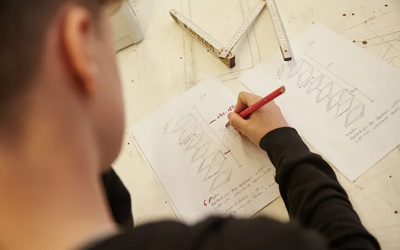 Zunächst müssen die wichtigsten Fragen geklärt werden: Welche Maße soll das Regal haben? Welches Design passt zu Jacobs Sneakern? Und: wie soll das Regal im Zimmer angebracht werden? Eine Skizze entsteht – angepasst auf die Anzahl und Größe der Sneaker, sowie den Begebenheiten in Jacobs Zimmer. „Der erste Entwurf entstand in einem lebhaften Austausch: Jacob hatte ganz konkrete Vorstellungen, wie sein Regal aussehen soll. Ich habe die Ideen angenommen, skizziert und an manchen Punkten Gegenvorschläge unterbreitet“, beschreibt Karsten Schillings den Visualisierungsprozess. Nach der Konstruktion folgt die Einweisung. Jacob ist Laie und hat noch keinerlei Erfahrung im Umgang mit den Elektrowerkzeugen und Materialien. Bevor die „Operation Sneaker-Regal“ startet, nimmt Karsten Schillings den Jungen mit auf eine Reise durch seine Werkstatt. „Herr Schillings hat mir alles genau erklärt und war sehr geduldig. Es war spannend, die unterschiedlichen Materialien und Werkzeuge kennen zu lernen“, erklärt Jacob seine Anfänge im Handwerk. Somit wird getestet, gefühlt und betrachtet. Dann kann es endlich losgehen und die ersten Regalbretter werden zugeschnitten.