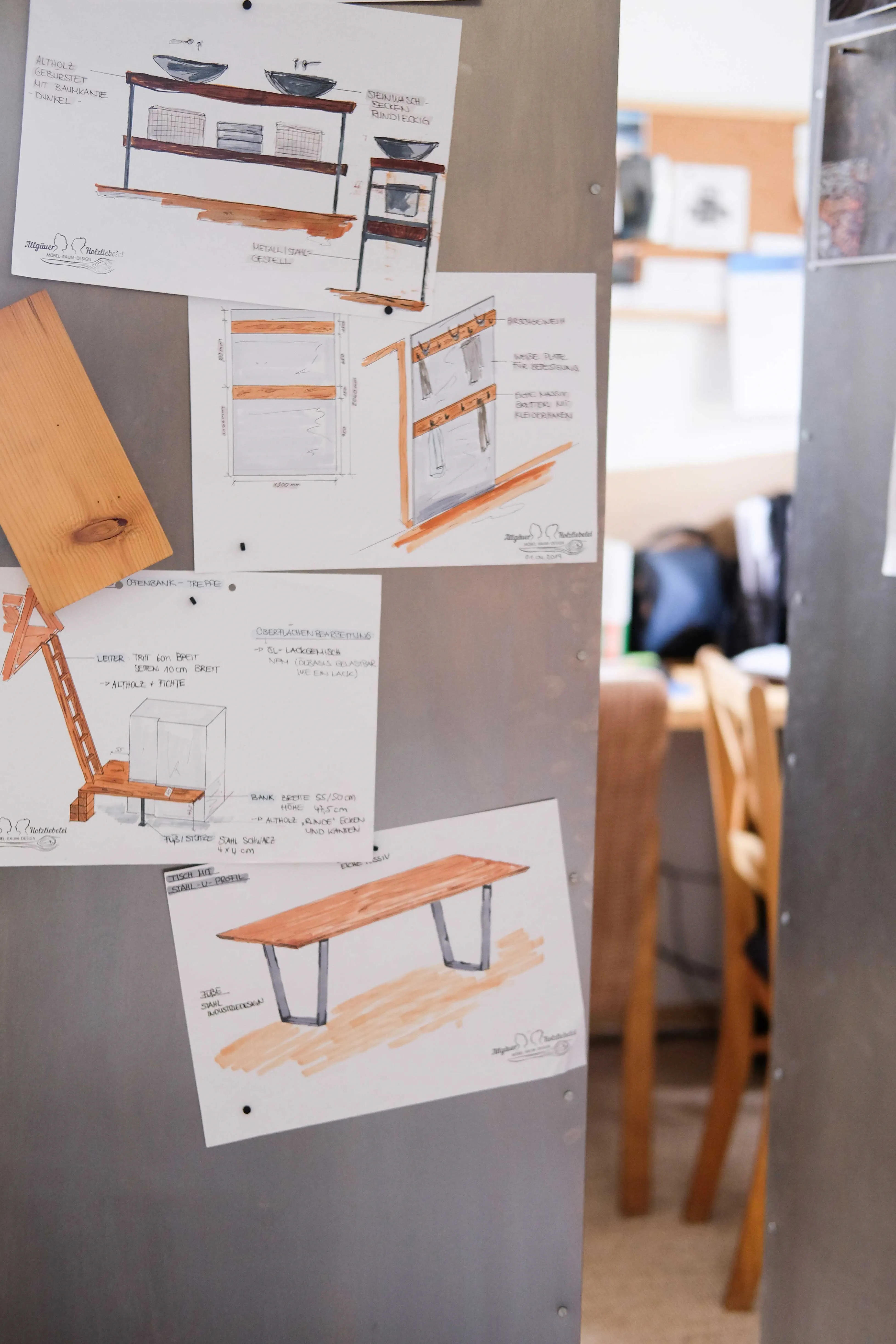 Die Unikate entstehen allesamt zunächst am Schreibtisch. In einer Skizze wird das Wunschmöbelstück zum ersten Mal sichtbar. „Das ist für mich immer ein ganz besonderer Moment“, verrät uns Ricarda. „Hier kann man seine Kreativität voll einbringen und gleichzeitig die Wünsche der Kunden eins zu eins umsetzen.“ So unterschiedlich wie die Aufträge sind, so unterschiedlich ist auch die Schwierigkeit der Projekte: „Unser anspruchsvollster Job bisher war der Bau einer Weinlounge-Ecke in einem Privathaus. Momentan planen wir die Ausstattung einer Bar. Dabei erstellen wir auch das gesamte Raumdesign und fertigen später die einzelnen Elemente“, berichtet Lisa.