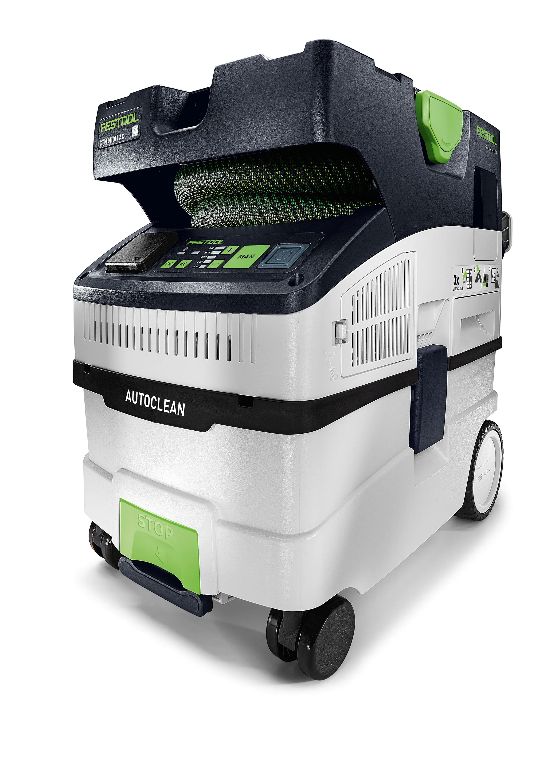 Festool hat seine AUTOCLEAN Funktion technisch weiterentwickelt und jetzt auch in seine Kompaktklasse integriert. Dank dieser automatischen Filterreinigung (AC) bleibt die Saugleistung auch bei längeren Einsätzen konstant hoch. Zudem lassen sich durch die längere Filterlebensdauer und den geringeren Wartungsaufwand Kosten und Zeit sparen. Festool empfiehlt diese neuen Sauger insbesondere für mineralische Stäube.