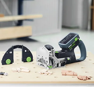 Das DOMINO System bietet Dübel in verschiedenen Größen (4x20 mm bis 10x50 mm) und zwei Holzarten für Innen- und Außenanwendungen. Ergänzt wird es durch umfangreiches Zubehör wie Rund- und Leistenanschlag sowie wieder lösbare Verbindungsbeschläge – ideal für Möbel-, Korpus-, Innen- und Messebau. Die DFC 500 ist Teil des Festool 18V Systems und überzeugt mit einem Gewicht von nur 3,4 Kilogramm.