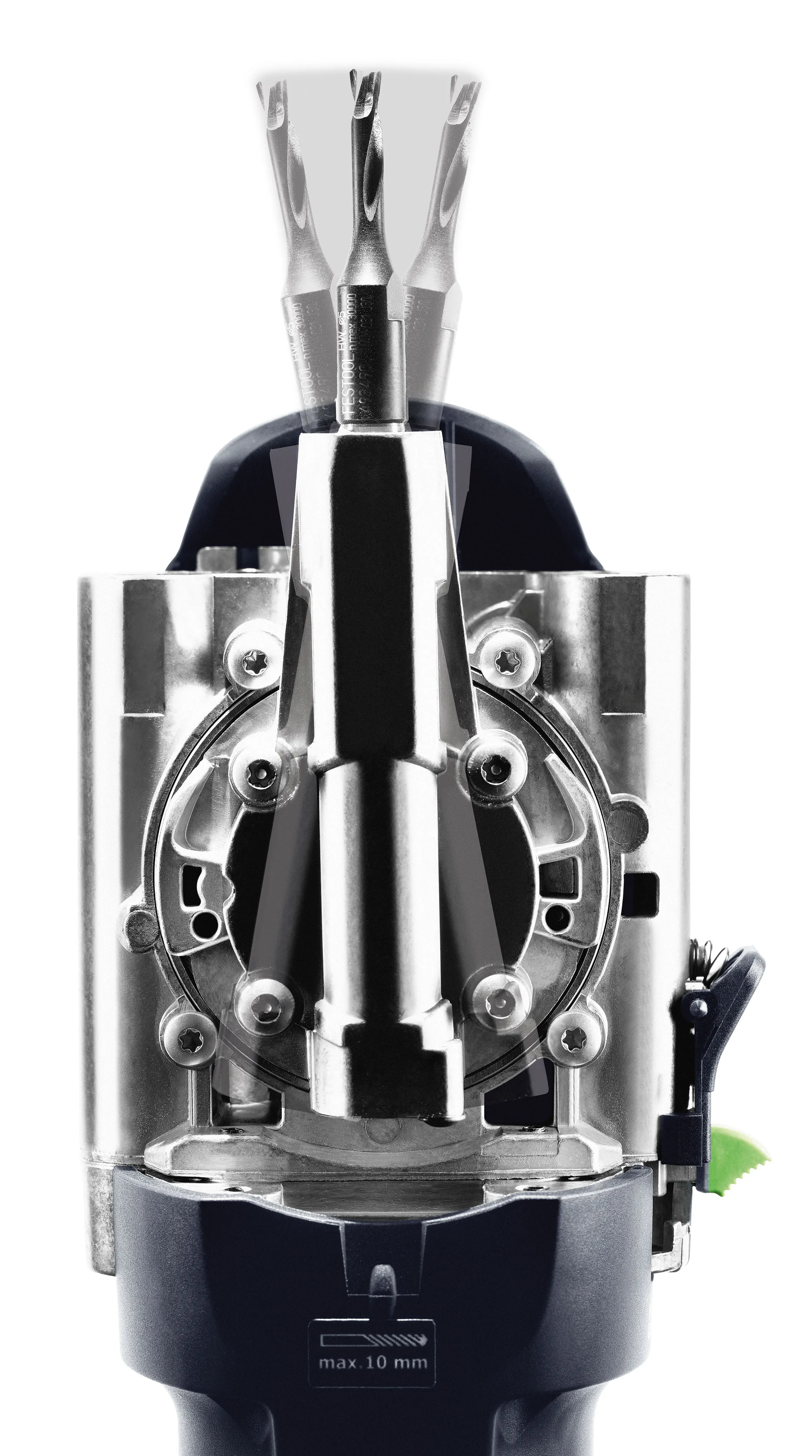 Arbeiten – auch bei längeren Einsätzen. Vier integrierte Anschlagpins sorgen für schnelle und präzise Positionierung der Dübelfräse, ganz ohne aufwendiges Anzeichnen. So lassen sich auch Dübelgruppen effizient und wiederholgenau setzen.