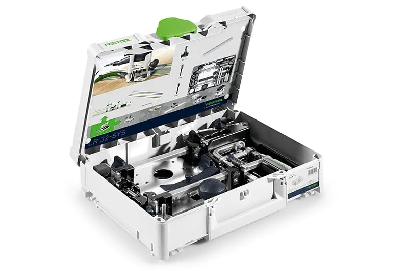 Festool hat verschiedene Zubehör-Systainer zusammengestellt, in denen für bestimmte Anwendungen alles ordentlich verstaut ist und immer bestens zur Hand ist, wenn man es braucht. So sind beispielsweise präzise Lochreihen beim Herstellen von Möbeln immer wieder ein Thema wie man sie für Fachbodenträger, Rückwandhalter und Beschläge benötigt. Im Systainer Lochreihenbohr-Set LR 32-SYS ist alles an Zubehör enthalten, was man zum Herstellen von präzisen Lochreihen benötigt. Damit lassen sich in Verbindung der Oberfräse OF 1010 oder OF 1400 und einer Führungsschiene FS 1400/2-LR 32 exakte Lochreihen im Rasterabstand von 32 Millimeter herstellen. Mit diesem Systainer LR 32-SYS bietet Festool eine optimale, mobile Lösung. Alles ist organisiert und griffbereit in einem Systainer: Führungsplatte, Zentrierdorn, HW-Beschlagbohrer Ø 35 mm, HW-Dübelbohrer Ø 5 mm (Dachform), HW-Dübelbohrer Ø 5 mm (mit Zentrierspitze und Vorschneider), 2 Seitenanschläge mit Anschlagreiter, Schraubzwingen FSZ 120, 2 x Längenanschlag. Dazu gibt es passende LR-Führungsschienen in zwei Längen mit 1400 oder 2424 Millimeter.