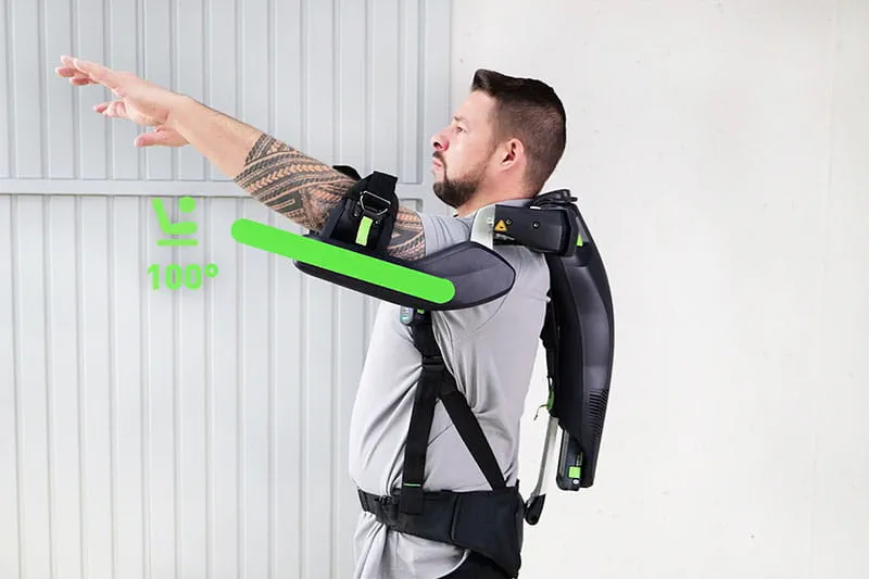 Das ExoActive ist ein aktives Exoskelett. Die Unterstützungskraft kann daher exakt auf die jeweilige Tätigkeit eingestellt werden. Dank seines leistungsstarken Festool 18 Volt Akkupacks bringt das ExoActive genau die Extraportion Kraft mit, um ermüdende Arbeiten über Kopf spielend leicht gelingen zu lassen. Ob hüftaufwärts, in Brusthöhe oder über Kopf: Sowohl der Arbeitsbereich als auch die Stärke der Unterstützung sind in Sekundenschnelle eingestellt. Die Leistung kann bei Bedarf auch ganz pausiert werden. Somit unterstützt das ExoActive gezielt dort, wo es soll, und ist dabei so leicht anzuziehen wie ein Rucksack. Es lässt sich zudem schnell und individuell auf unterschiedliche Körpergrößen einstellen und ist somit auch in puncto Ergonomie hervorragend auf sämtliche Körpertypen angepasst. „Wer einmal mit der Unterstützung eines aktiven Exoskeletts gearbeitet hat, wird es nie wieder ohne unser ExoActive mit einer Wand oder Decke aufnehmen wollen. Vor allem bei Über-Kopf-Arbeiten lassen sich durch das Exoskelett Überlastungen viel leichter vermeiden. Unser ExoActive entlastet die vordere Schultermuskulatur um bis zu 30 Prozent*. Das bedeutet, dass sich Tätigkeiten um bis zu einem Drittel leichter anfühlen. Wir haben zudem – das ist ein Alleinstellungsmerkmal in diesem Produktsegment – ein aktives System. Das heißt, wir führen externe Energie hinzu. Dadurch lässt sich das ExoActive in Sekundenschnelle auf jede Arbeitssituation einstellen. Das ExoActive arbeitet mit einem 18 Volt Akkupack von Festool, so wie er auch bei unseren anderen Werkzeugen zum Einsatz kommt. Insofern ist es eine perfekte Ergänzung unseres bestehenden Akkusystems“, erklärt Dominic Ender, Produktmanager des ExoActive Exoskeletts.