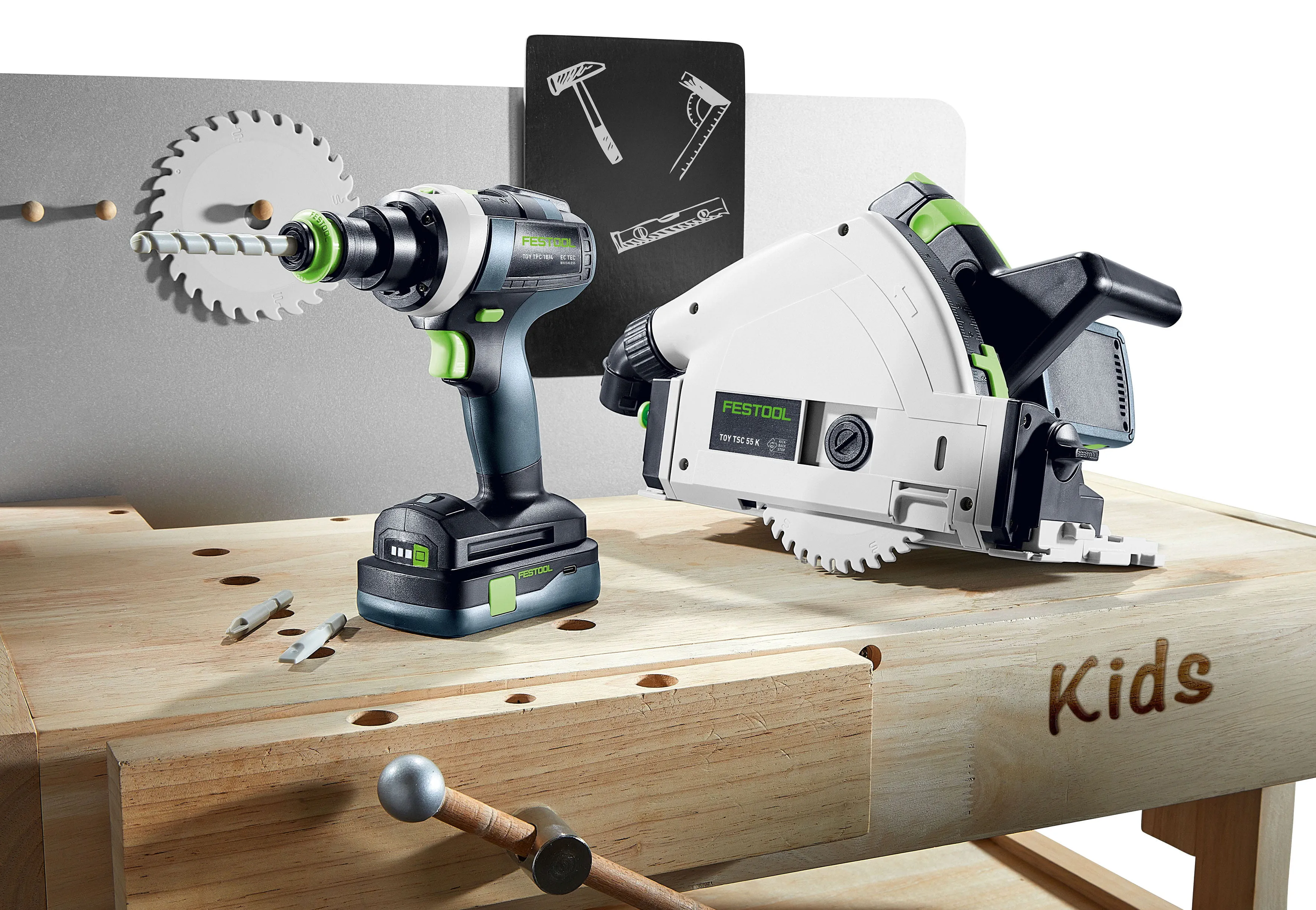 Ab September gibt es für die kleinen Fans Werkzeuge von Festool zum Spielen. Auch hier gilt: Qualität trifft auf Style und Emotionen, denn in originalgetreuer Nachbildung bietet Festool nun zwei Spielzeuge für Kinder ab drei Jahren an - die Akku-Tauchsäge TY-TSC und den Akku-Bohrschrauber TY-TPC.