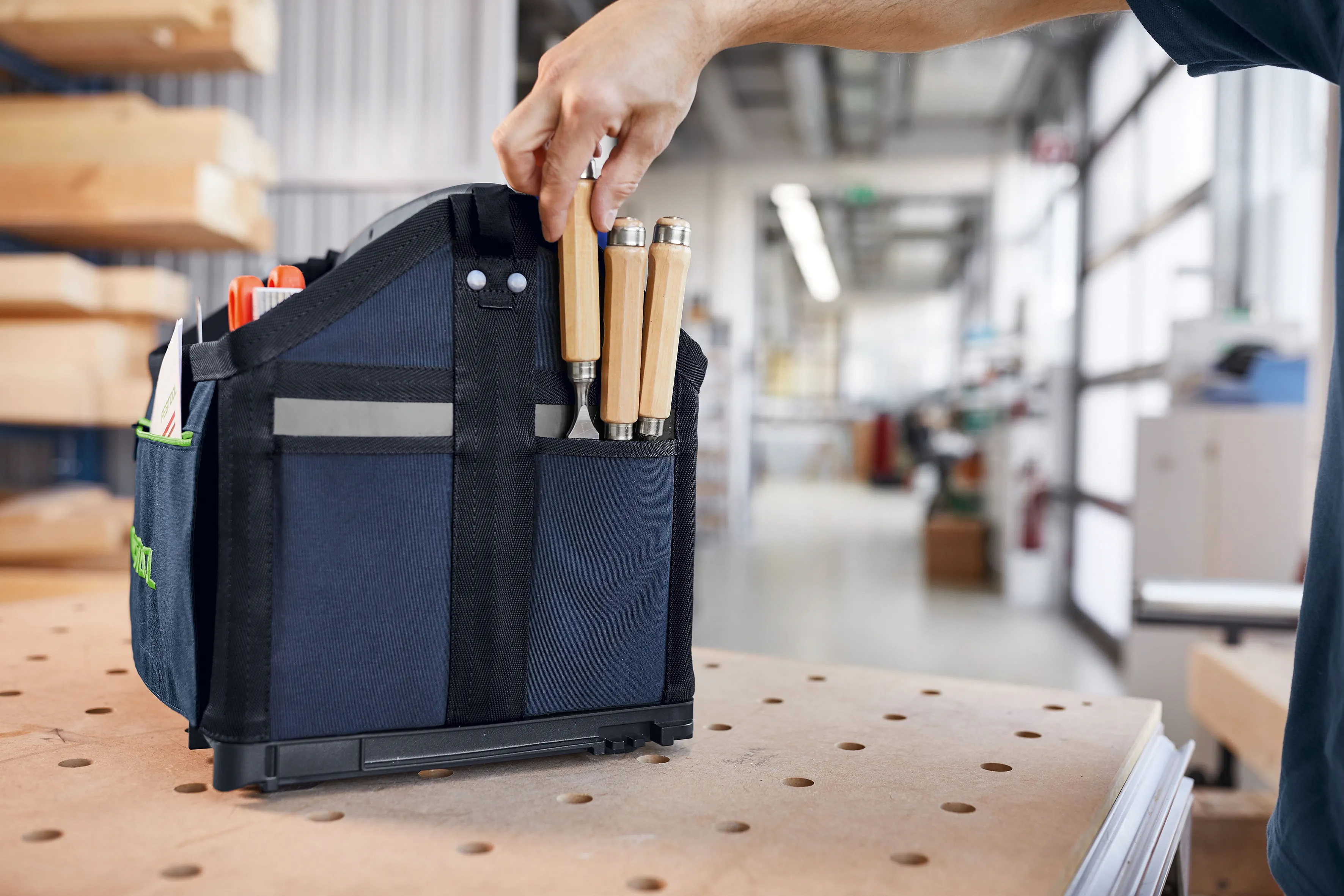 Dabei erweist sich die ToolBag im Alltag als äußerst robust und aus hochwertigem Textil und bietet bis zu 20 kg Tragkraft. Hohe Flexibilität durch individuelle Anordnung der Handwerkzeuge. Zusätzlich bietet sie vielfältige Möglichkeiten durch innen und außen angebrachte Fächer. Der stabile Handgriff mit Softgrip bietet unterwegs einen angenehmen Tragekomfort dank Tragegurt mit Schulterpad. Obendrein ist die ToolBag kompatibel zum gesamten Festool Systainer System – zudem ist er einfach zu koppeln und zu transportieren. Die Innentaschen können individuell angeordnet werden, so ist die ToolBag blitzschnell für jeden Einsatz passend bestückt. Die Griffmulde erleichtert zudem die Entnahme aus dem Fahrzeugregal. Praktisch: Die seitlichen Außentaschen bieten weiteren Stauraum für Handwerkzeuge und Zubehör. In einem separaten Fach können Visitenkarten sauber und ordentlich untergebracht werden. An der Vorder- und Rückseite der ToolBag befindet sich jeweils eine Tasche mit Reißverschluss. Darin sind Dokumente und Kleinteile ordentlich aufbewahrt und man hat schnell Zugriff, ohne lange zu suchen. Von der Werkstatt über den Transport im Fahrzeug bis zur Baustelle – immer perfekt organisiert. Dank der speziellen Aufnahme kann die ToolBag direkt in die bott vario3 Fahrzeugeinrichtung integriert werden. Die Systainer³ ToolBag ist ab Oktober im ausgewählten Fachhandel erhältlich.