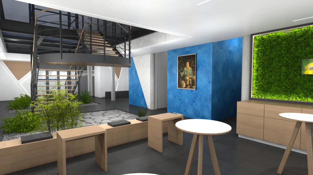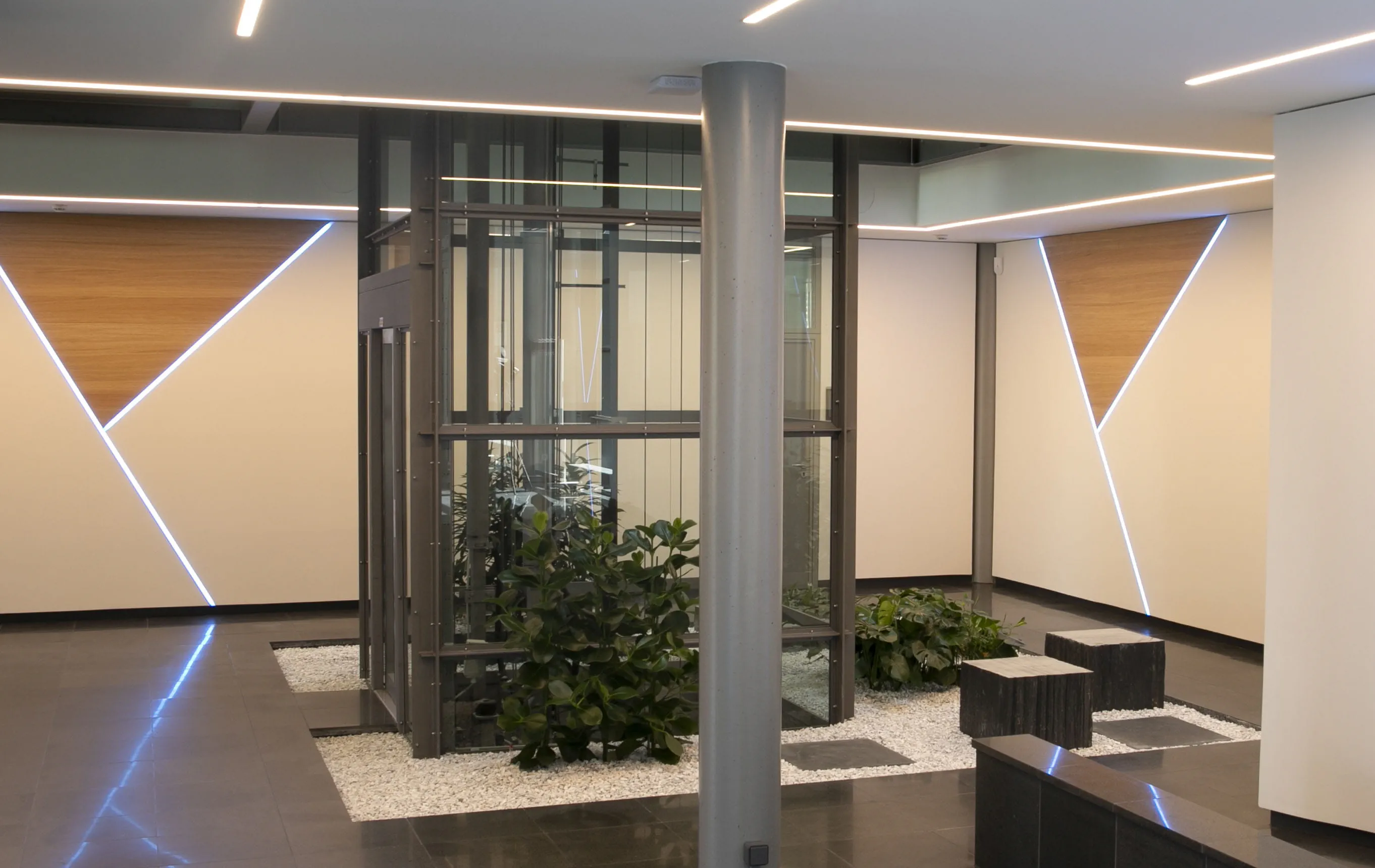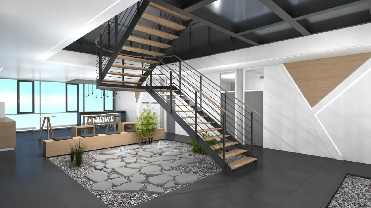 Industriekunde Harro Höfliger stellt Produktions- und Verpackungsmaschinen an verschiedenen Standorten in Baden-Württemberg her. Am Stammsitz Allmersbach im Tal soll das Erdgeschoss eines bestehenden Gebäudes in ein neues Kundenzentrum umgebaut werden. Pläne stehen fest und Malerbetrieb Stelzle ist beauftragt, sie in die Tat umzusetzen. Gewünscht sind LED Lichtbänder an Decke und Wand. An der Wand hat Malerbetrieb Stelzle die Nut für die Profilleisten mit Hilfe einer Oberfräse und einer Führungsschiene eingefräst. Nun ging es an die Decke und genau da wird es schwierig: Wie den Bildern zu entnehmen ist, sollen die LED Lichtbänder eine indirekte Lichtquelle darstellen – und das bis zu einer Länge von 13 Metern rund um die Treppe.