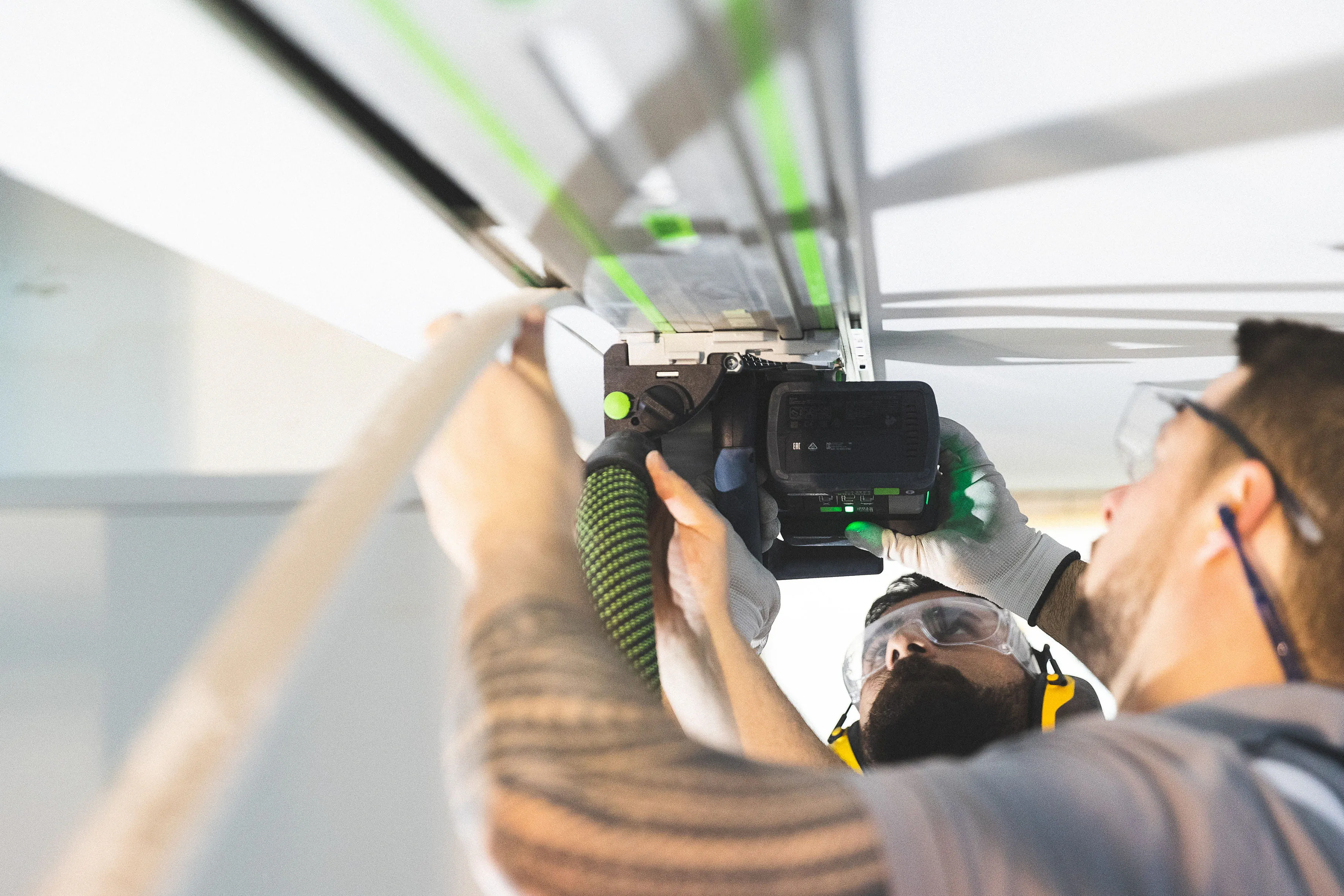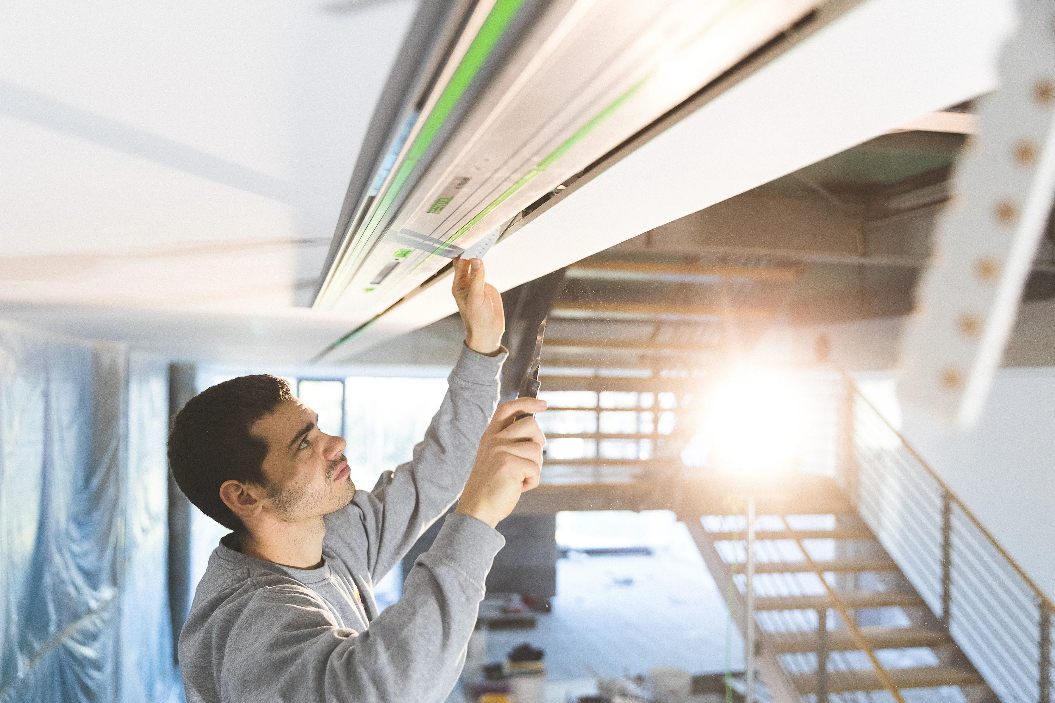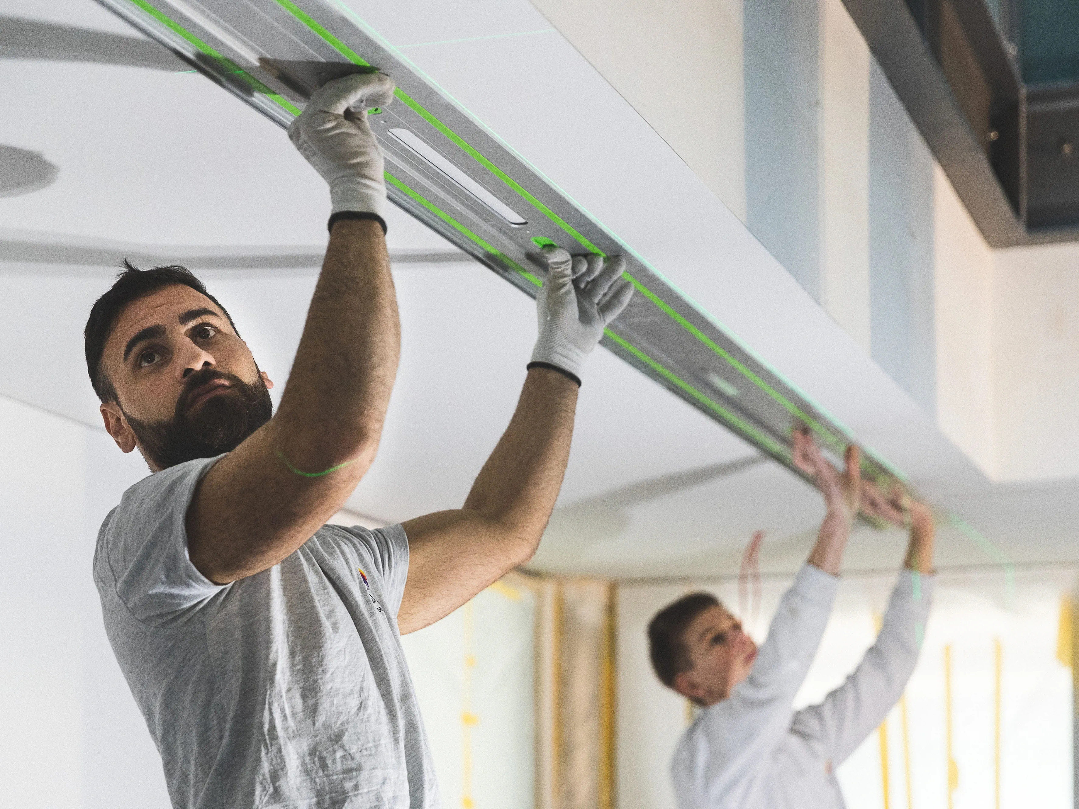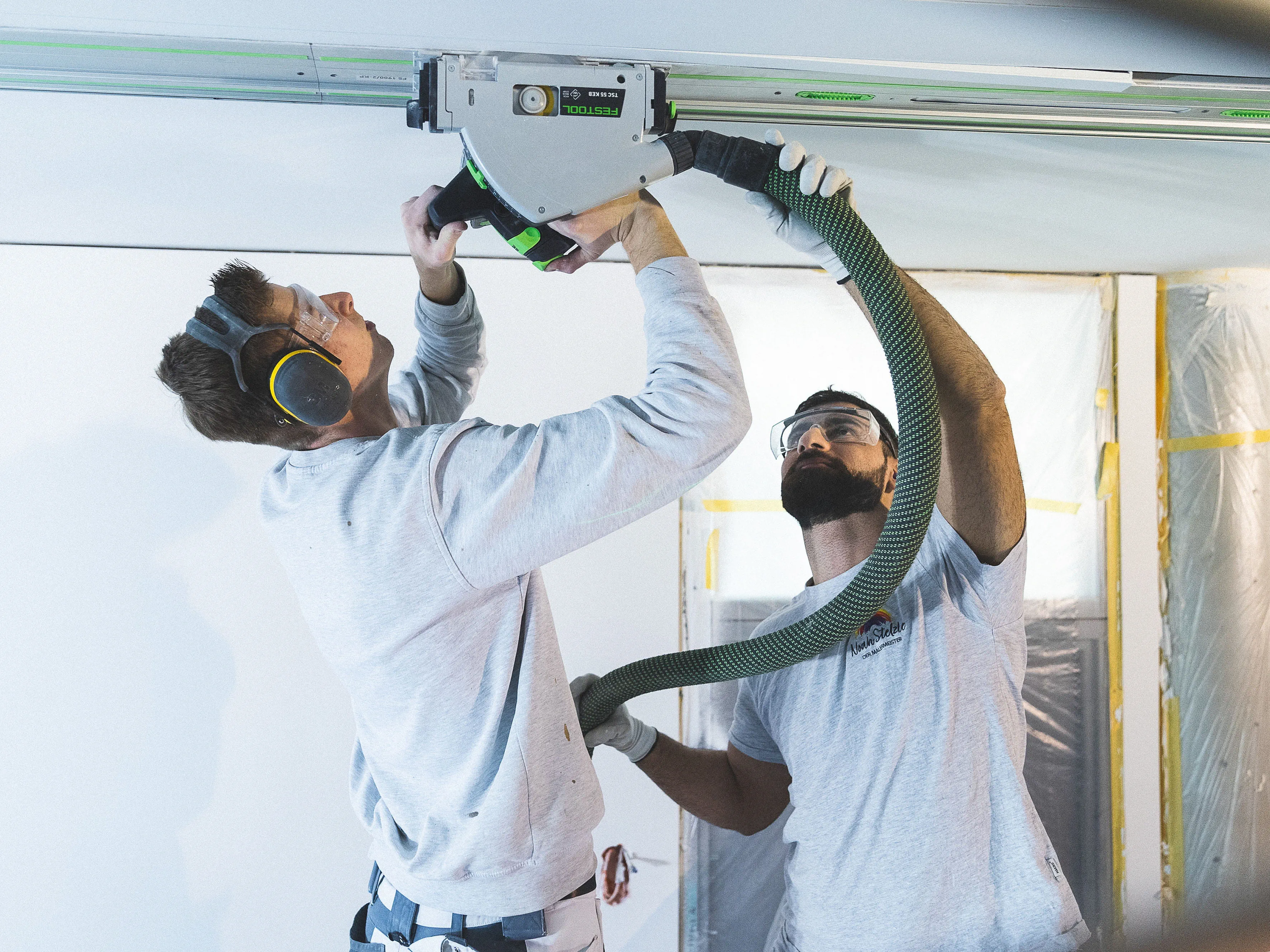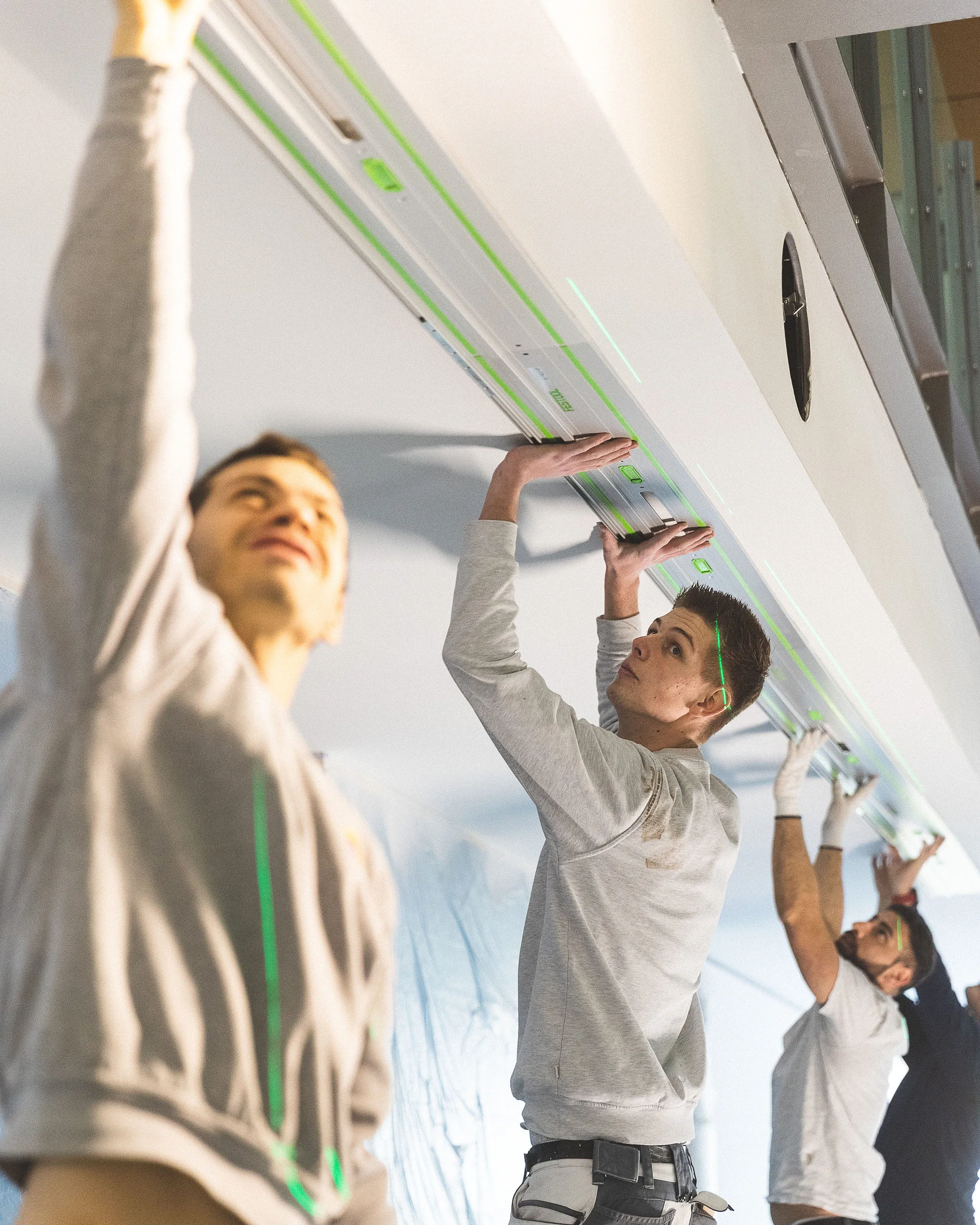 Noah Stelzle und sein Mitarbeiter Raphael Berg zeichnen alle relevanten Markierungspunkte nach dem vorgegebenen Plan direkt an die Decke an. (Bild 3) Um absolut sicher zu sein, dass die zu sägende Linie gerade in der langen Flucht von 13 Metern ist, richtet Noah Stelzle mit Hilfe eines Kreuzlinienlasers die Linie an die Decke aus. (Bild 4) Um eine möglichst lange und exakte Sägeführung an der Decke zu bekommen, empfiehlt Trainer Georg von dem Bussche dem Stelzle Team drei Führungsschienen mit jeweils zwei Verbindungs-stücken zu verbinden (s. Tipp 1). Damit kommen 5.70 Meter zusammen. (Bild 5) Bevor die verlängerte Führungsschiene von 5,7 Meter an der Decke fixiert wird, befestigt Chef Noah Stelzle die Klebepads (s. Tipp 2) an der erweiterten Führungsschiene FS und überprüft, ob die Pads richtig sitzen. (Bild 6) Nun folgt ein entscheidender Moment: Die lange Führungsschiene soll an der Decke fixiert werden. Da bedarf es mehrere Hände und Fingerspitzengefühl. Das Team fixiert die extra lange Führungsschiene an der Linie des Kreuzlinienlasers – zunächst mit den Klebepads – und da die Oberfläche an der Decke noch nicht grundiert ist, ist es sicherer, die extra lange Führungsschiene für den Schnitt mit Schrauben zusätzlich zu fixieren. (Bild 7) Stelzle Mitarbeiter Muharrem Kuyucu befestigt zunächst die Führungsschiene mit den neuen Klebepads an den Untergrund. (Bild 8) Um sicher zu gehen, dass sich während des extra langen Sägeschnitts die Führungsschiene nicht von der Decke löst, fixiert Muharrem Kuyucu sie mit Hilfe eines Akku-Bohrschraubers mit Schrauben an der Decke. (Bild 9) Nun folgt ein weiterer, entscheidender Moment: Raphael Berg sägt die erste Linie mit der Akku-Tauchsäge TSC 55 KEB und dem Kreissägeblatt Wood Universal (HW 160x1,8x20 W28) entlang der extra langen Laserlinie exakt gerade. (s. Tipp 3) (Bild 10) Im nächsten Schritt löst das Team wieder die lange Führungsschiene von den Schrauben und verschiebt sie dank der speziell dafür angefertigten Ansetzhilfe (s. Tipp 4) exakt für den zweiten parallelen Schnitt – damit das Profilelement ideal passt. (Bild 11) Jetzt geht es um die zweite Linie für das Profilelement. Das Stelzle Team hilft zusammen, um auch den zweiten, parallelen Schnitt präzise mit der Akku-Tauchsäge TSC 55 zu erhalten. (Bild 12) Noah Stelzle kontrolliert, ob sich alles zwischen den beiden Schnitten an der Decke gelöst hat, damit sich später das Profilelement für das LED Lichtband optimal einlegen lässt. (Bild 13) Bei diesem Arbeitsschritt bedarf es wieder mehrere Hände: Das Stelzle Team entfernt die extra lange Führungsschiene vorsichtig und stellt sie sicher ab. (Bild 14) Um Feinheiten im Eckbereich sauber zu entfernen, nimmt Muharrem Kuyucu den Akku-Oszillierer VECTURO OSC 18 mit Universal-Sägeblatt USB 50/35/Bi/OSC zur Hand. (s. Tipp 5). (Bild 15) Abschließend kontrolliert Raphael Berg mittels des Profilelements, ob alles richtig zugesägt ist und sieht: alles passt ideal. Im Anschluss können die Maler die komplette Decke beschichten und nach der Trocknung die Profilleiste einbauen für die LED Lichtbänder. (Bild 16)
