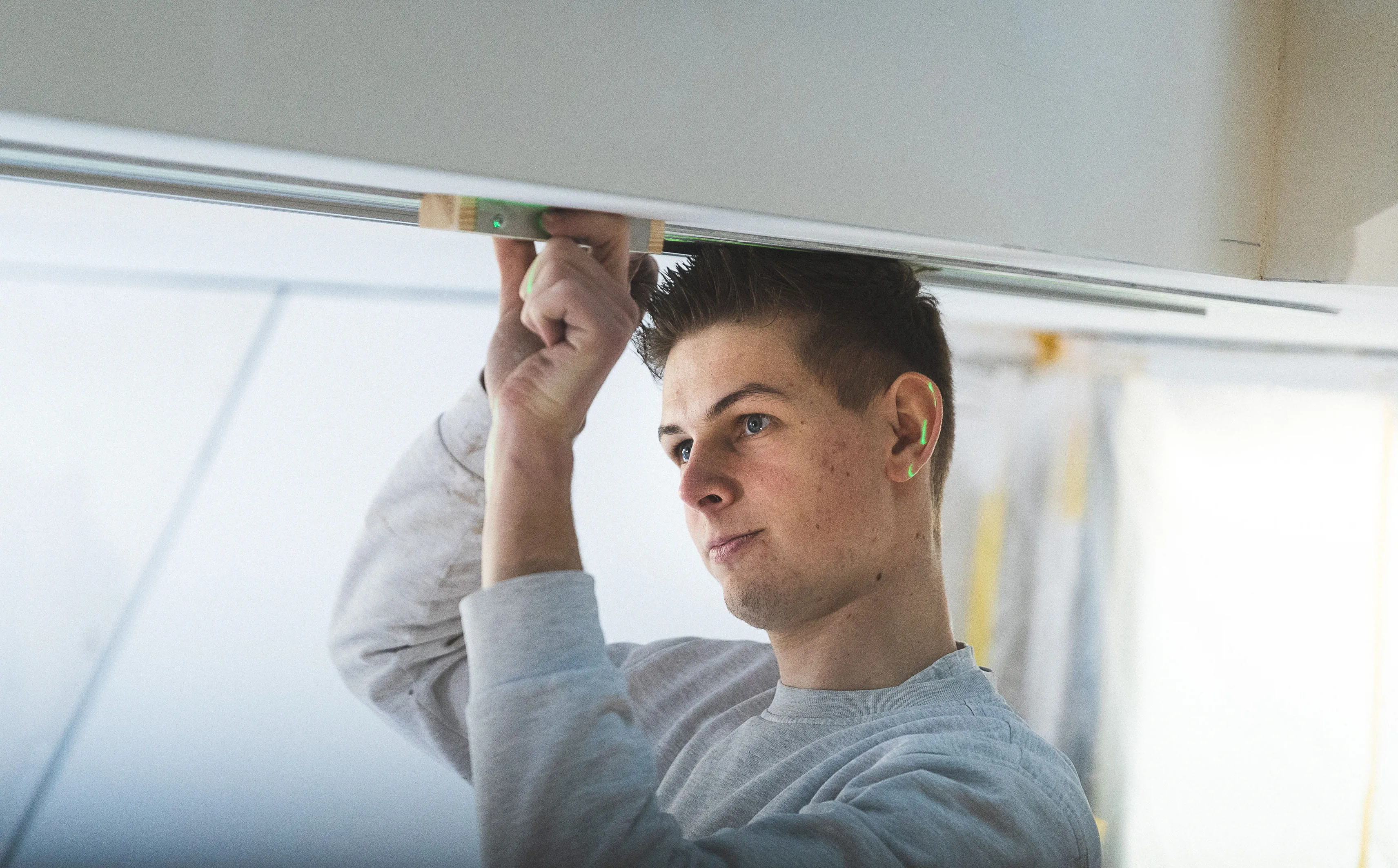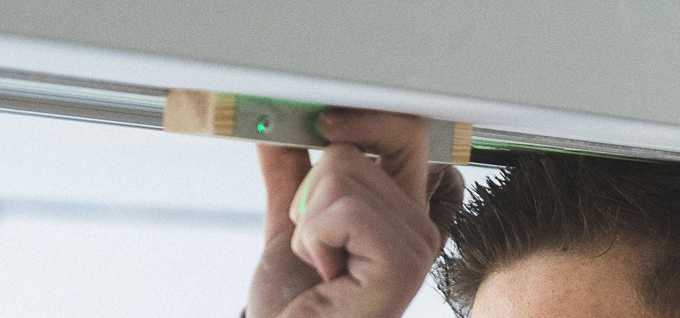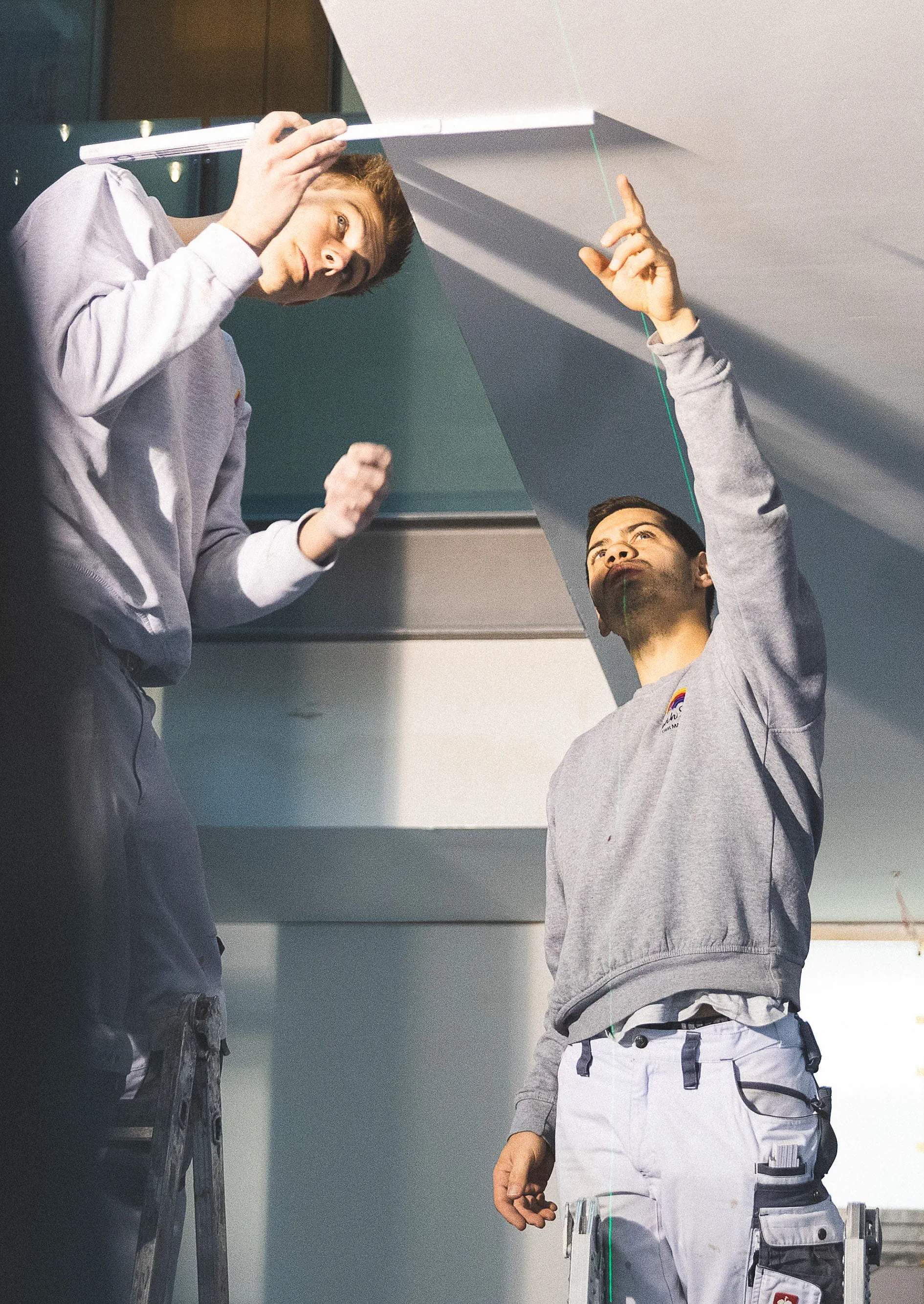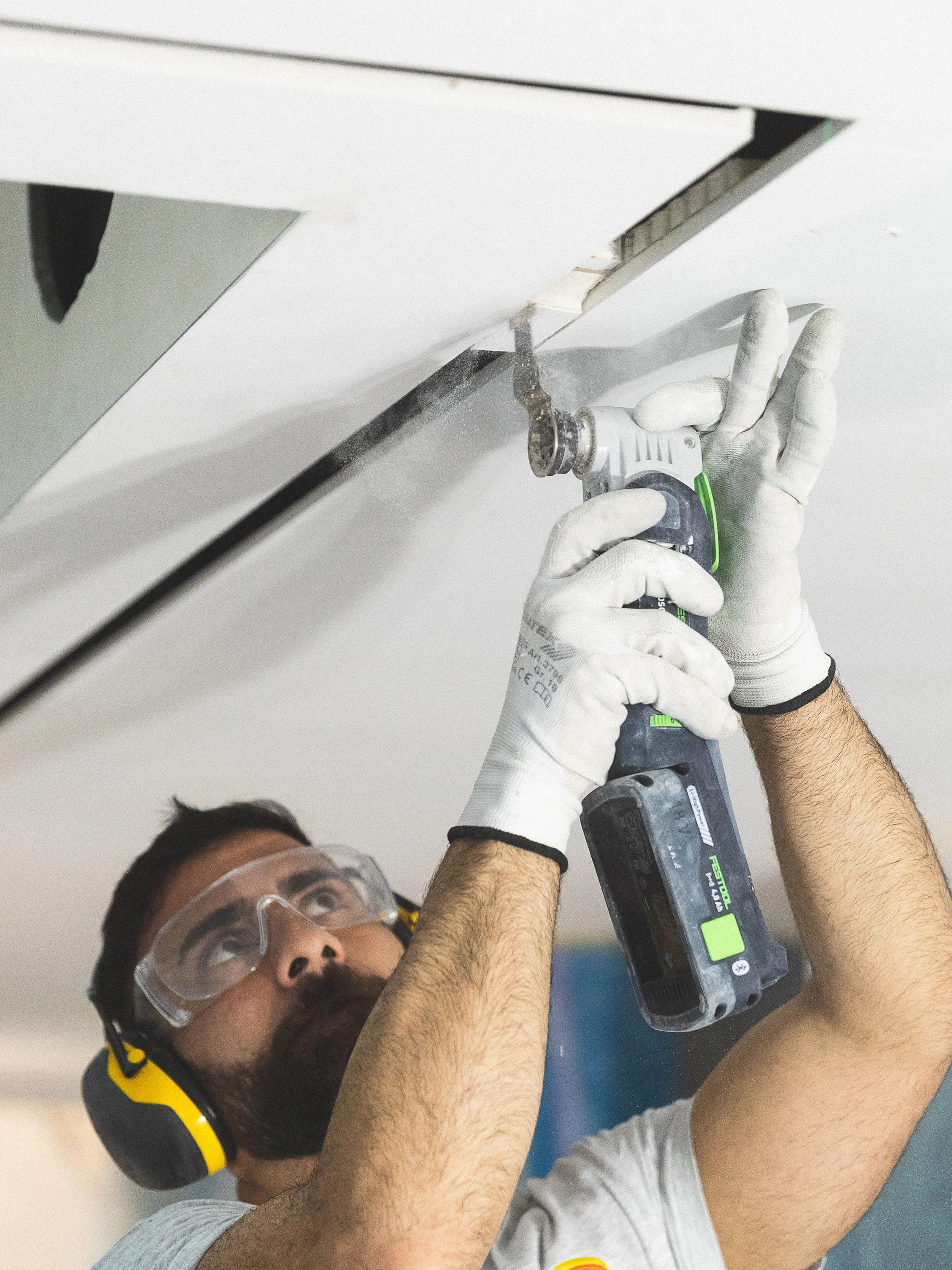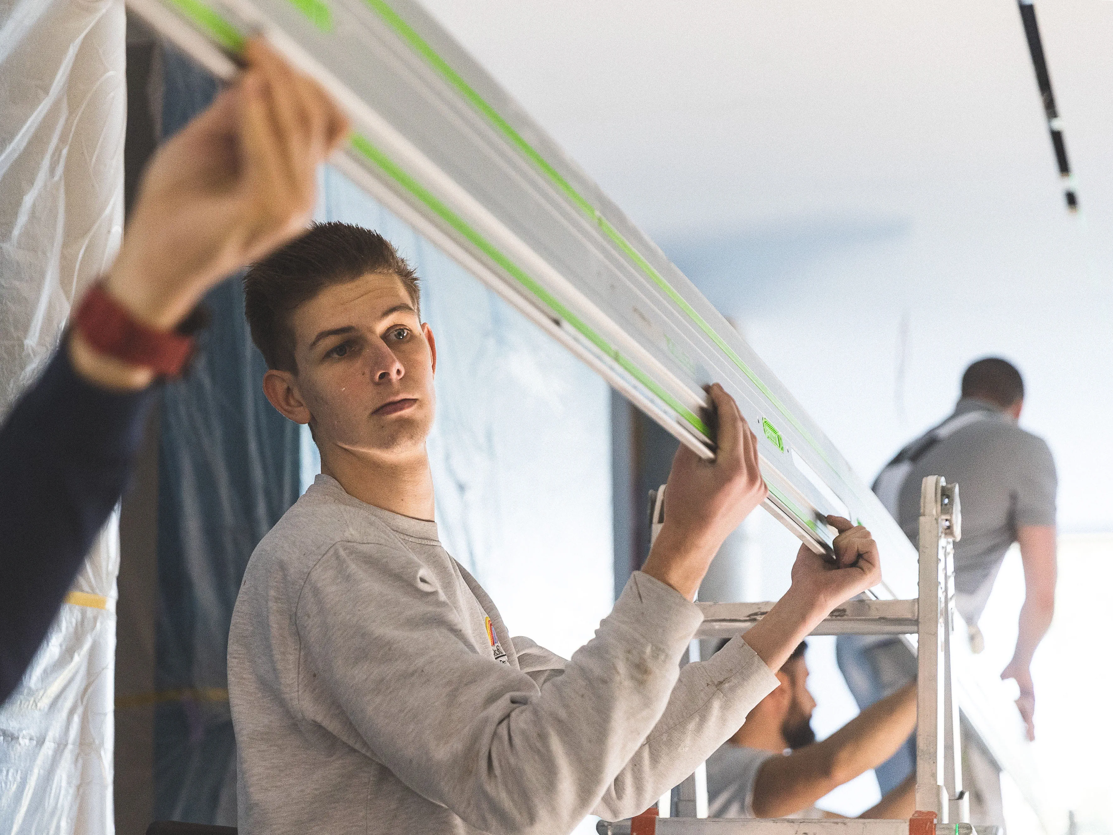 Noah Stelzle und sein Mitarbeiter Raphael Berg zeichnen alle relevanten Markierungspunkte nach dem vorgegebenen Plan direkt an die Decke an. (Bild 3) Um absolut sicher zu sein, dass die zu sägende Linie gerade in der langen Flucht von 13 Metern ist, richtet Noah Stelzle mit Hilfe eines Kreuzlinienlasers die Linie an die Decke aus. (Bild 4) Um eine möglichst lange und exakte Sägeführung an der Decke zu bekommen, empfiehlt Trainer Georg von dem Bussche dem Stelzle Team drei Führungsschienen mit jeweils zwei Verbindungs-stücken zu verbinden (s. Tipp 1). Damit kommen 5.70 Meter zusammen. (Bild 5) Bevor die verlängerte Führungsschiene von 5,7 Meter an der Decke fixiert wird, befestigt Chef Noah Stelzle die Klebepads (s. Tipp 2) an der erweiterten Führungsschiene FS und überprüft, ob die Pads richtig sitzen. (Bild 6) Nun folgt ein entscheidender Moment: Die lange Führungsschiene soll an der Decke fixiert werden. Da bedarf es mehrere Hände und Fingerspitzengefühl. Das Team fixiert die extra lange Führungsschiene an der Linie des Kreuzlinienlasers – zunächst mit den Klebepads – und da die Oberfläche an der Decke noch nicht grundiert ist, ist es sicherer, die extra lange Führungsschiene für den Schnitt mit Schrauben zusätzlich zu fixieren. (Bild 7) Stelzle Mitarbeiter Muharrem Kuyucu befestigt zunächst die Führungsschiene mit den neuen Klebepads an den Untergrund. (Bild 8) Um sicher zu gehen, dass sich während des extra langen Sägeschnitts die Führungsschiene nicht von der Decke löst, fixiert Muharrem Kuyucu sie mit Hilfe eines Akku-Bohrschraubers mit Schrauben an der Decke. (Bild 9) Nun folgt ein weiterer, entscheidender Moment: Raphael Berg sägt die erste Linie mit der Akku-Tauchsäge TSC 55 KEB und dem Kreissägeblatt Wood Universal (HW 160x1,8x20 W28) entlang der extra langen Laserlinie exakt gerade. (s. Tipp 3) (Bild 10) Im nächsten Schritt löst das Team wieder die lange Führungsschiene von den Schrauben und verschiebt sie dank der speziell dafür angefertigten Ansetzhilfe (s. Tipp 4) exakt für den zweiten parallelen Schnitt – damit das Profilelement ideal passt. (Bild 11) Jetzt geht es um die zweite Linie für das Profilelement. Das Stelzle Team hilft zusammen, um auch den zweiten, parallelen Schnitt präzise mit der Akku-Tauchsäge TSC 55 zu erhalten. (Bild 12) Noah Stelzle kontrolliert, ob sich alles zwischen den beiden Schnitten an der Decke gelöst hat, damit sich später das Profilelement für das LED Lichtband optimal einlegen lässt. (Bild 13) Bei diesem Arbeitsschritt bedarf es wieder mehrere Hände: Das Stelzle Team entfernt die extra lange Führungsschiene vorsichtig und stellt sie sicher ab. (Bild 14) Um Feinheiten im Eckbereich sauber zu entfernen, nimmt Muharrem Kuyucu den Akku-Oszillierer VECTURO OSC 18 mit Universal-Sägeblatt USB 50/35/Bi/OSC zur Hand. (s. Tipp 5). (Bild 15) Abschließend kontrolliert Raphael Berg mittels des Profilelements, ob alles richtig zugesägt ist und sieht: alles passt ideal. Im Anschluss können die Maler die komplette Decke beschichten und nach der Trocknung die Profilleiste einbauen für die LED Lichtbänder. (Bild 16)