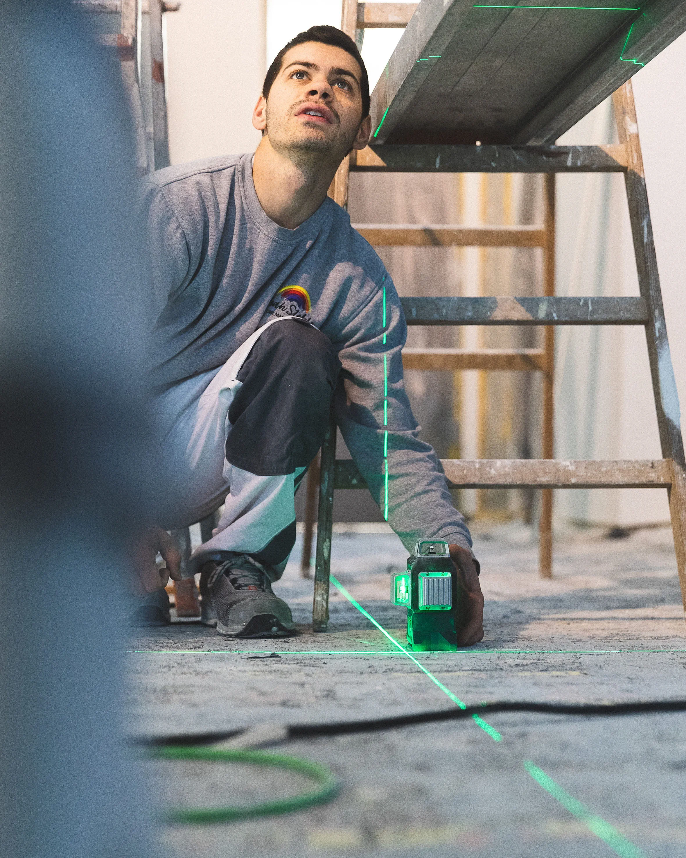 Um an der Decke die beiden Linien für die Profilleiste exakt und präzise aussägen zu können, muss die Führungsschiene am Kreuzlinenlaser platziert sein und für den zweiten Schnitt ebenso exakt und parallel an der ersten Linie verlaufen. Dazu empfiehlt Philipp Stahl dem Stelzle Team vorab mehrere Ansetzhilfen bzw. Schablonen zu erstellen.