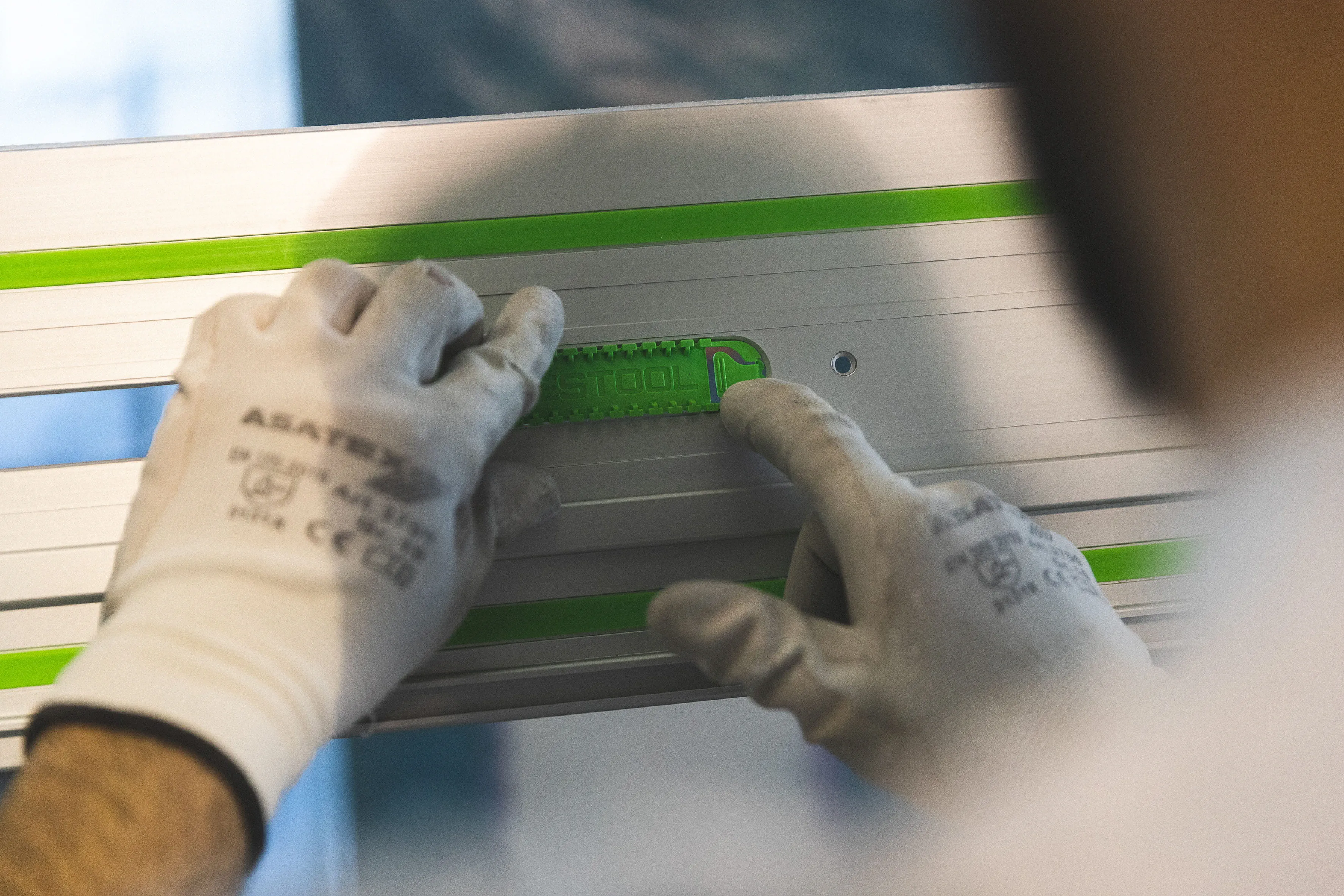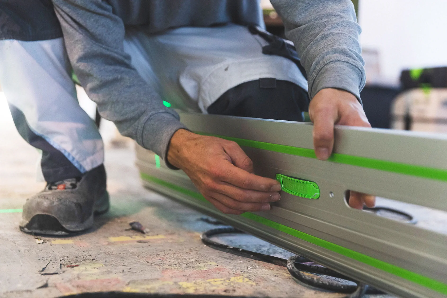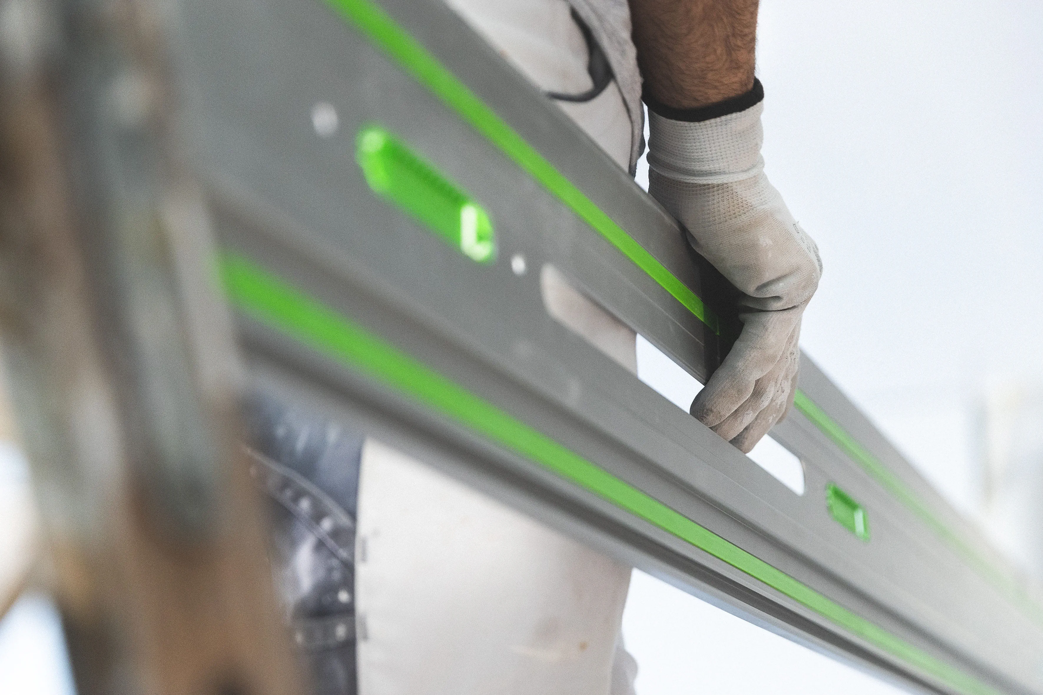 Führungsschienen gibt es in verschiedenen Größen. Mit einem Führungsschienenverbinder lassen sich alle Führungsschienen leicht und einfach verbinden. Die Verbindungsstücke sind selbstausrichtend. Trainer von dem Bussche empfiehlt Malerbetrieb Stelzle seine vorhandenen Führungsschienen zu verwenden: So lassen sich drei FS 1900 zu einer Gesamtlänge von 5,70 Meter verbinden. Perfekt für lange Tauchschnitte an der Decke.