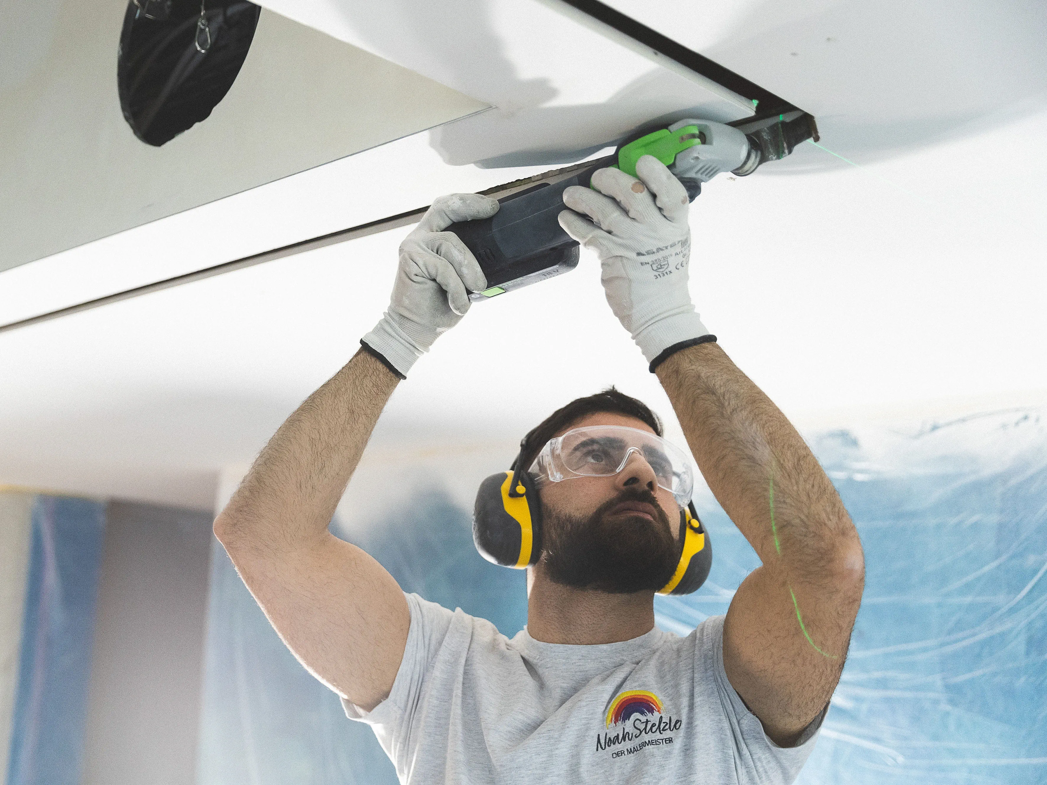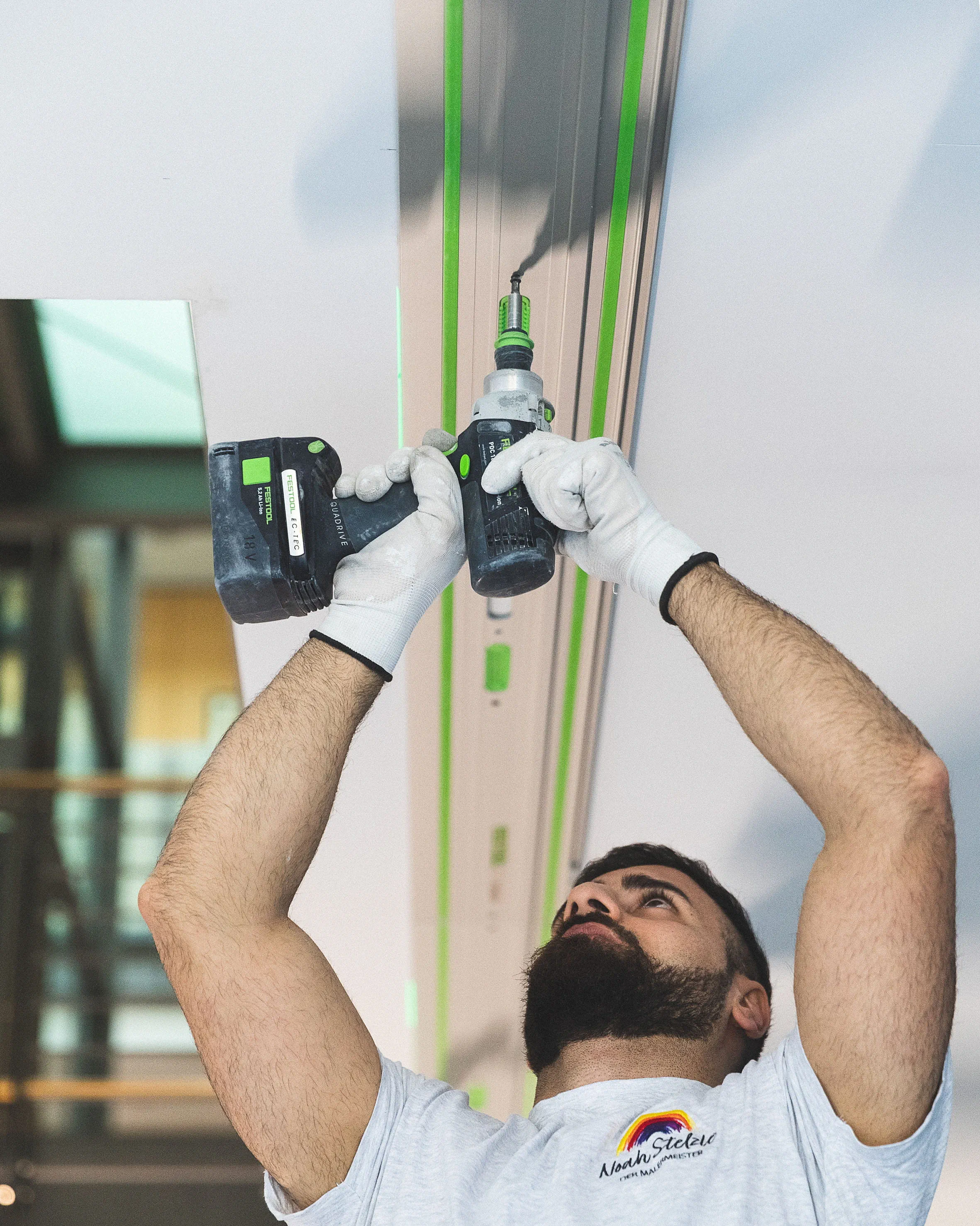 Maler Noah Stelzle wird neben Privatkunden auch von Industriekunden mit besonderen Wünschen beauftragt, die nicht alle Tage kommen und auch manchmal sehr speziell für ihn und sein Team sind. Solche Aufträge mit speziellen Anforderungen sind manchmal eine Herausforderung für das Team und können sich im Nachgang auch zum Trend entwickeln. Aus diesem Grund befasst sich Noah Stelzle ganz genau mit dieser speziellen Verarbeitungsweise und sucht nach einer optimalen und professionellen Lösung, indem er bei Malermeister und Anwendungstechniker Philipp Stahl und Trainer Georg von dem Bussche von Festool um Rat bittet.