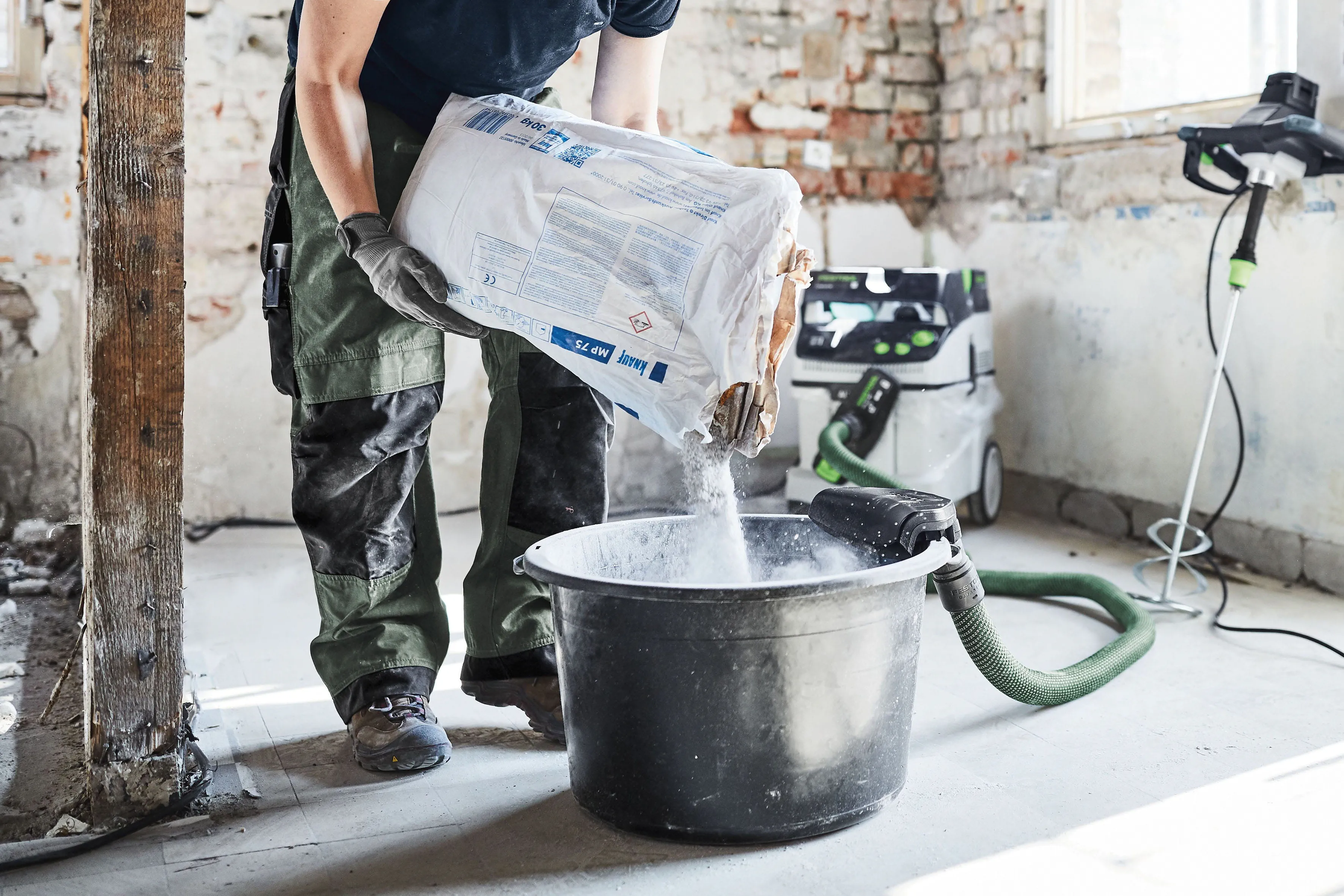 Festool hat in den Lieferumfang von jedem Rührwerk eine MX-Absaugung gepackt. Damit lässt sich jegliches Material rühren und mischen - ganz ohne Staub. Die MX-Absaugung wird einfach am Rand des Mischeimers geklemmt. Mit dem Einschalten des Saugers verschwindet der Staub bereits beim Einschütten des Mischmaterials in den Sauger. So kämpft man auch beim Rühren nicht mehr mit dichten Staubwolken. Das schont die Lungen des Anwenders und hinterlässt eine saubere Baustelle – ohne zusätzliche Reinigungsarbeiten.