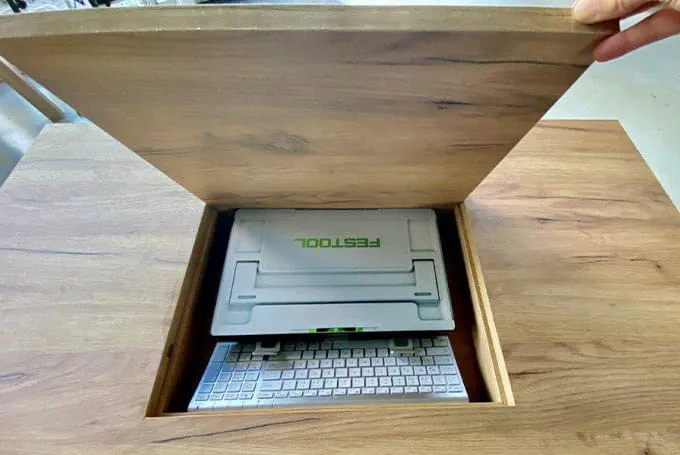 Alles im integrierten Fach unterhalb der Tischplatte verstauen und Deckel schließen.