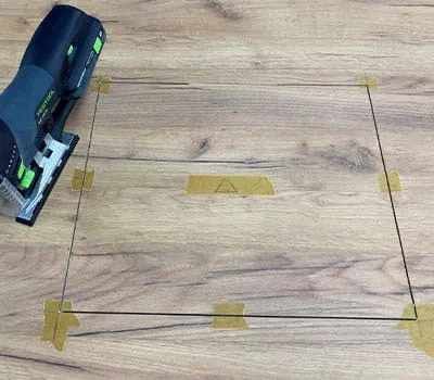 Im vorliegendem Anwendungsbeispiel erstellen wir gemeinsam eine eingelassene Revisionsklappe in einer furnierten Tischplatte, um einen Laptop direkt nach der Arbeit sauber zu verstauen und den Tisch für andere Zwecke nutzen zu können. Das Fach kann auch für andere Inlays genutzt werden. Da der Ausschnitt als Klappendeckel wieder eingebaut wird und wir nichts an der Maserung verändern möchten, muss der Schnitt rechts und links vom Sägeblatt absolut ausrissfrei sein. Die Tauchsäge mit Vorritzer hilft uns dabei.