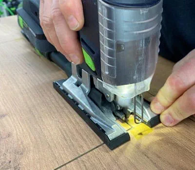 Jetzt müssen die Ecken noch ganz durchgeschnitten werden. Um auch hier Ausrisse zu vermeiden, achte bitte darauf, kein breiteres Stichsägeblatt als das Kreissägeblatt zu nutzen. Auf Einstellungen an der Säge achten. Splitterschutz montieren und Pendelhub ausschalten.