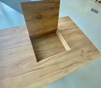 - Tisch/Tischplatte z.B. furnierte Spanplatte (zusätzlich Kantenmaterial/muss bekantet werden)