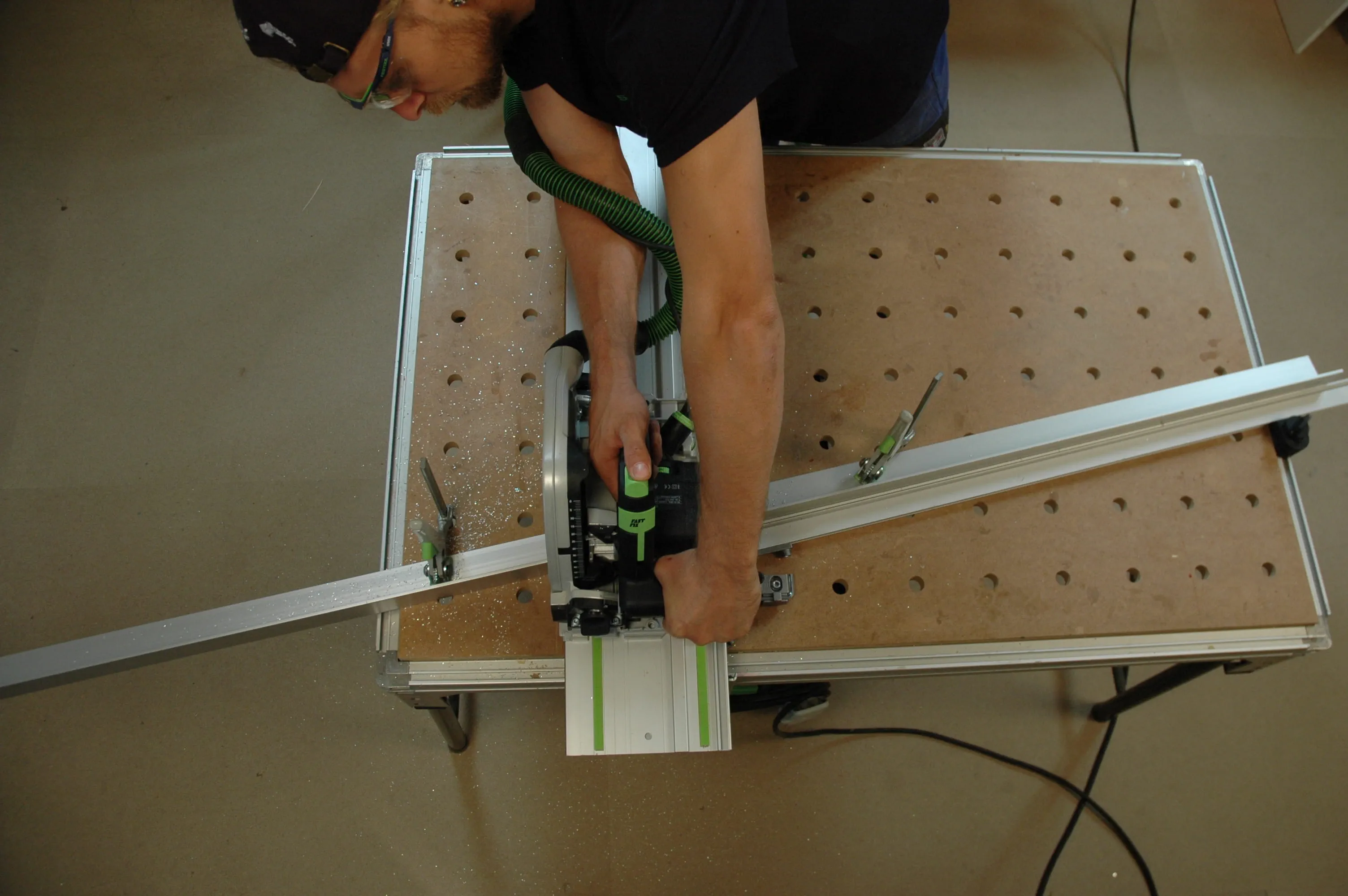 Hierbei sollte aber auf jeden Fall das passende Sägeblatt (Universal- oder Aluverzahnung) verwendet und die Drehzahl reduziert werden. Wichtig: Tragen Sie eine Schutzbrille, um Ihre Augen vor Aluminiumspänen zu schützen.
