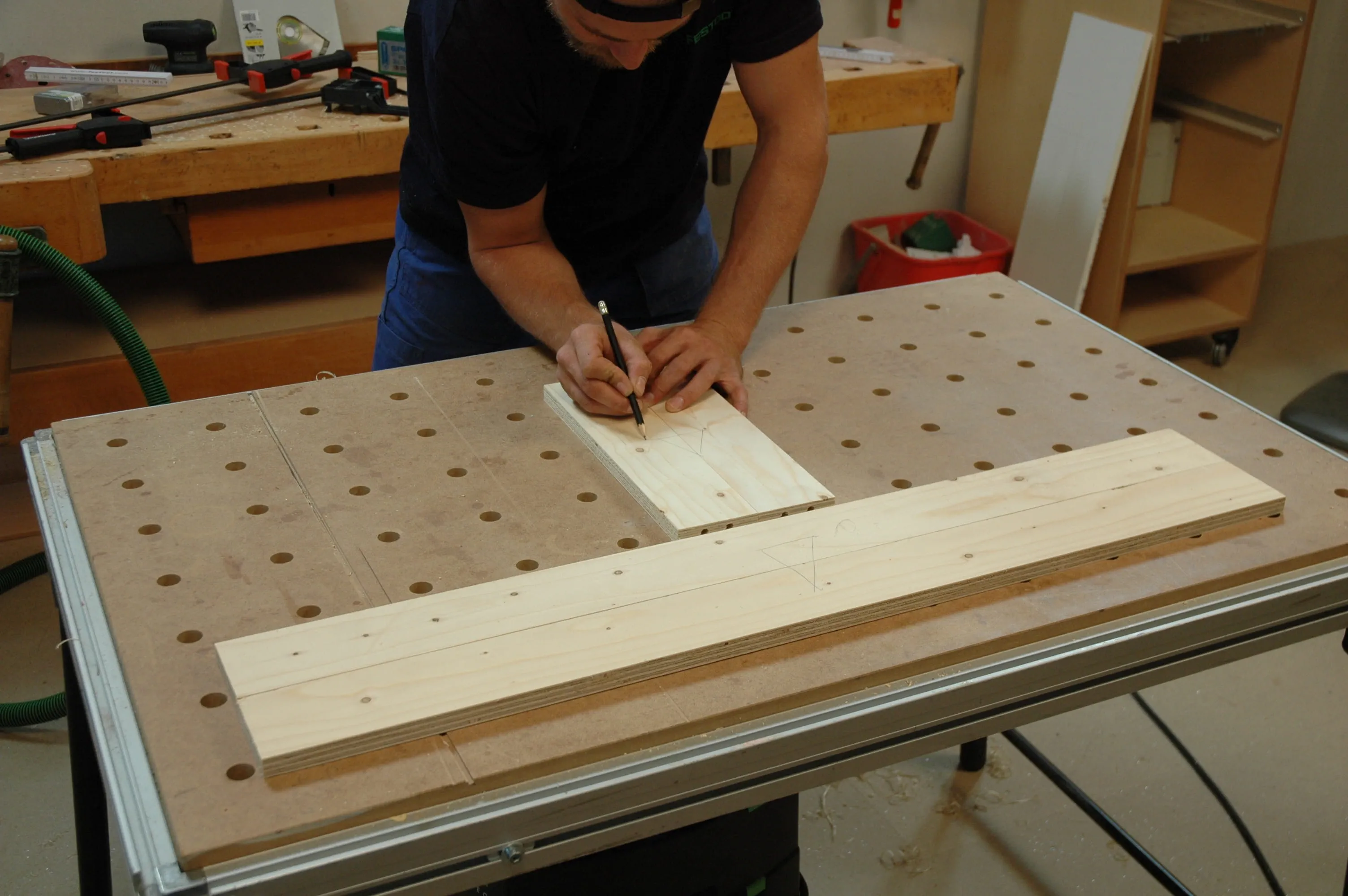 Kennzeichnen Sie die Positionen der einzelnen Rahmenteile mit Hilfe des Schreinerdreiecks (Infos zur Schablone und zum Schreinerdreieck unter www.Kurswerkstatt.de). Bohren Sie zunächst in die kurzen Schmalflächen der Rahmenschenkel (Pos. 6) jeweils zwei 8 mm Dübellöcher (Bohrtiefe halbe Dübellänge + 1mm).