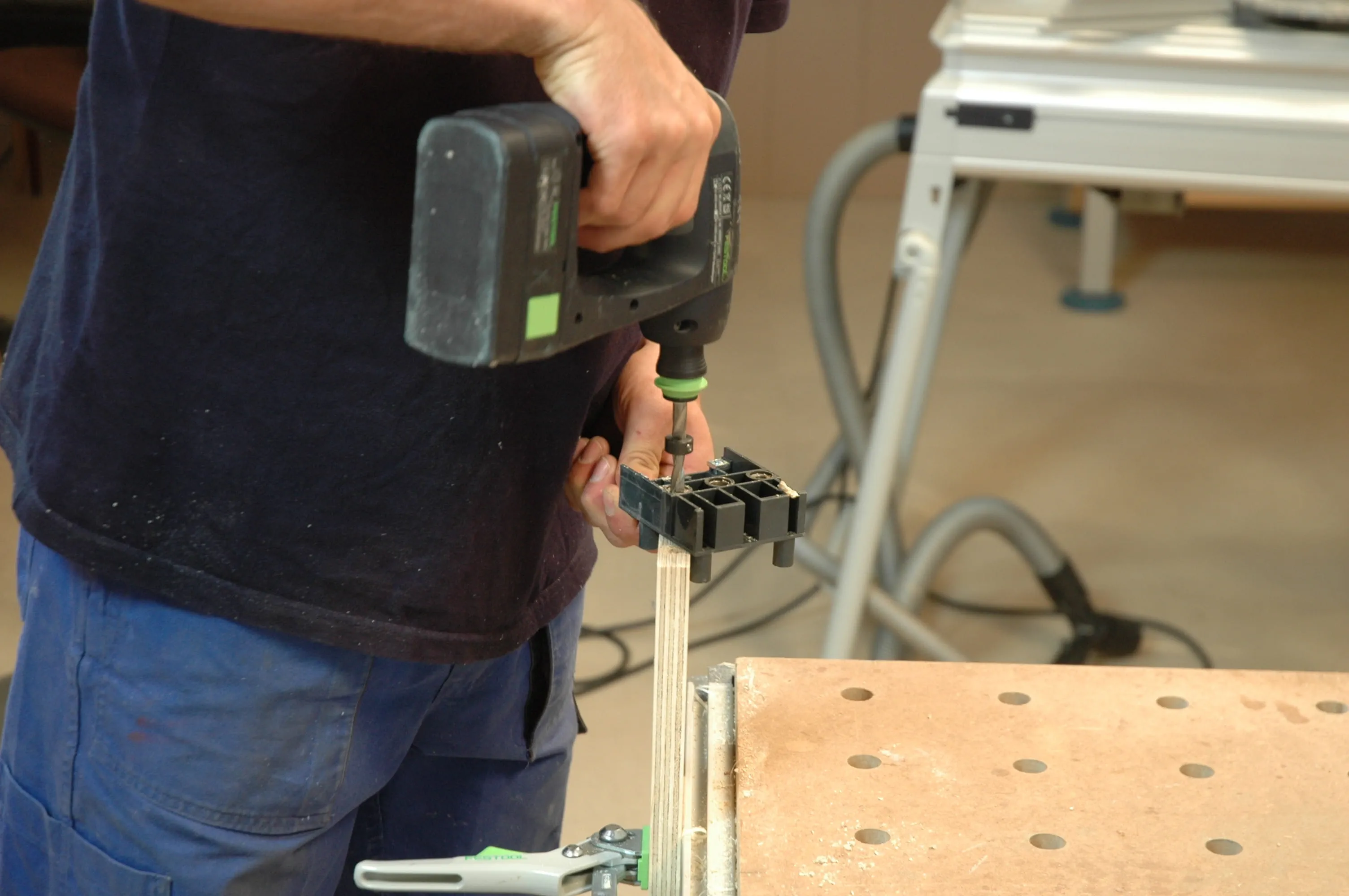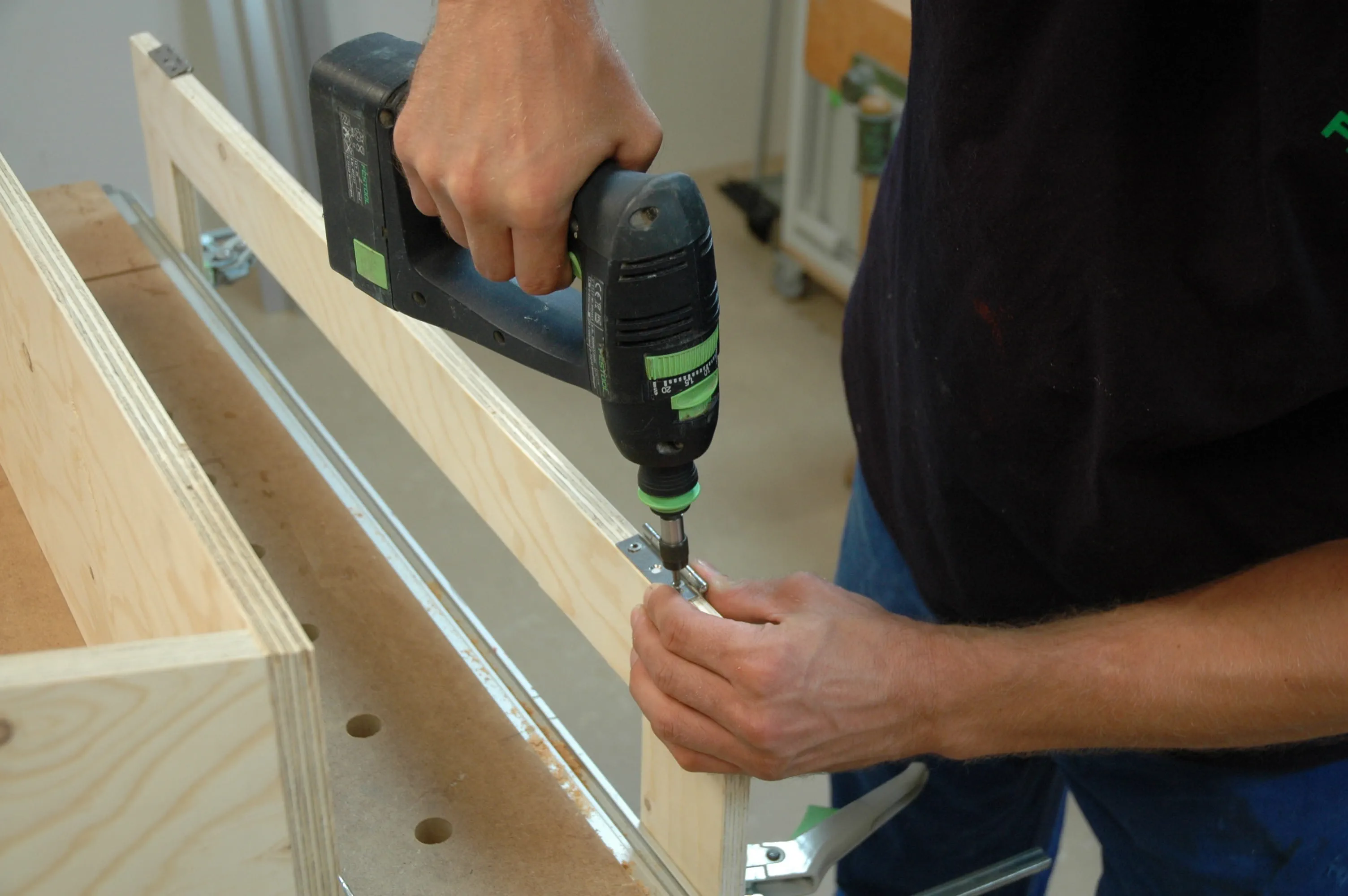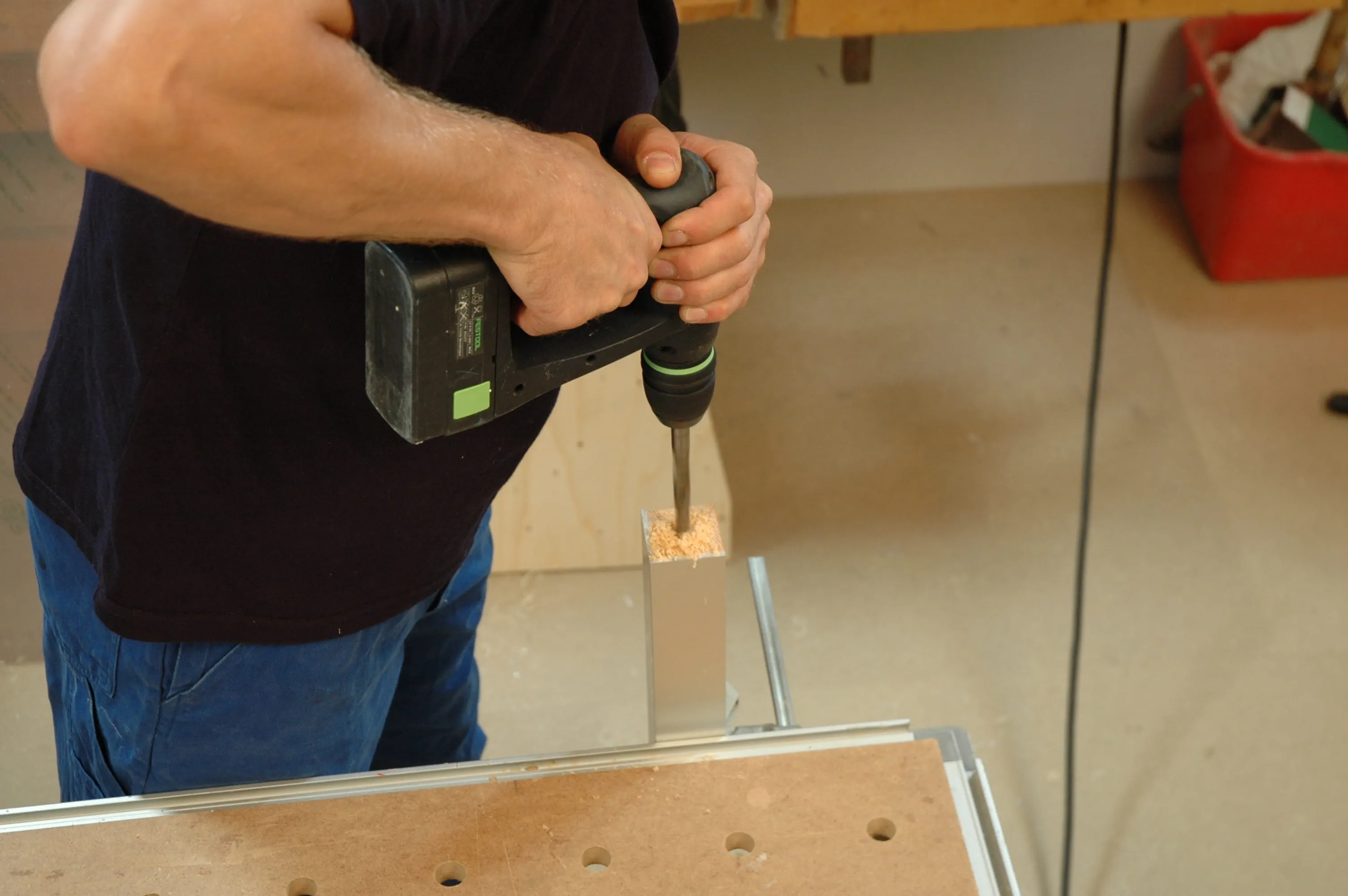 Die Bohrtiefe entspricht der Länge der Maschinenschraube. Der Bohrdurchmesser hängt von der Muffenart und vom Hersteller ab. Wenn Sie die leichter zu verarbeitenden Einschlagmuffen verwenden, sollten Sie diese nach dem Einschlagen zweimal durchbohren und mit Spax-Schrauben 3,5 x 35 gegen Herausrutschen sichern.