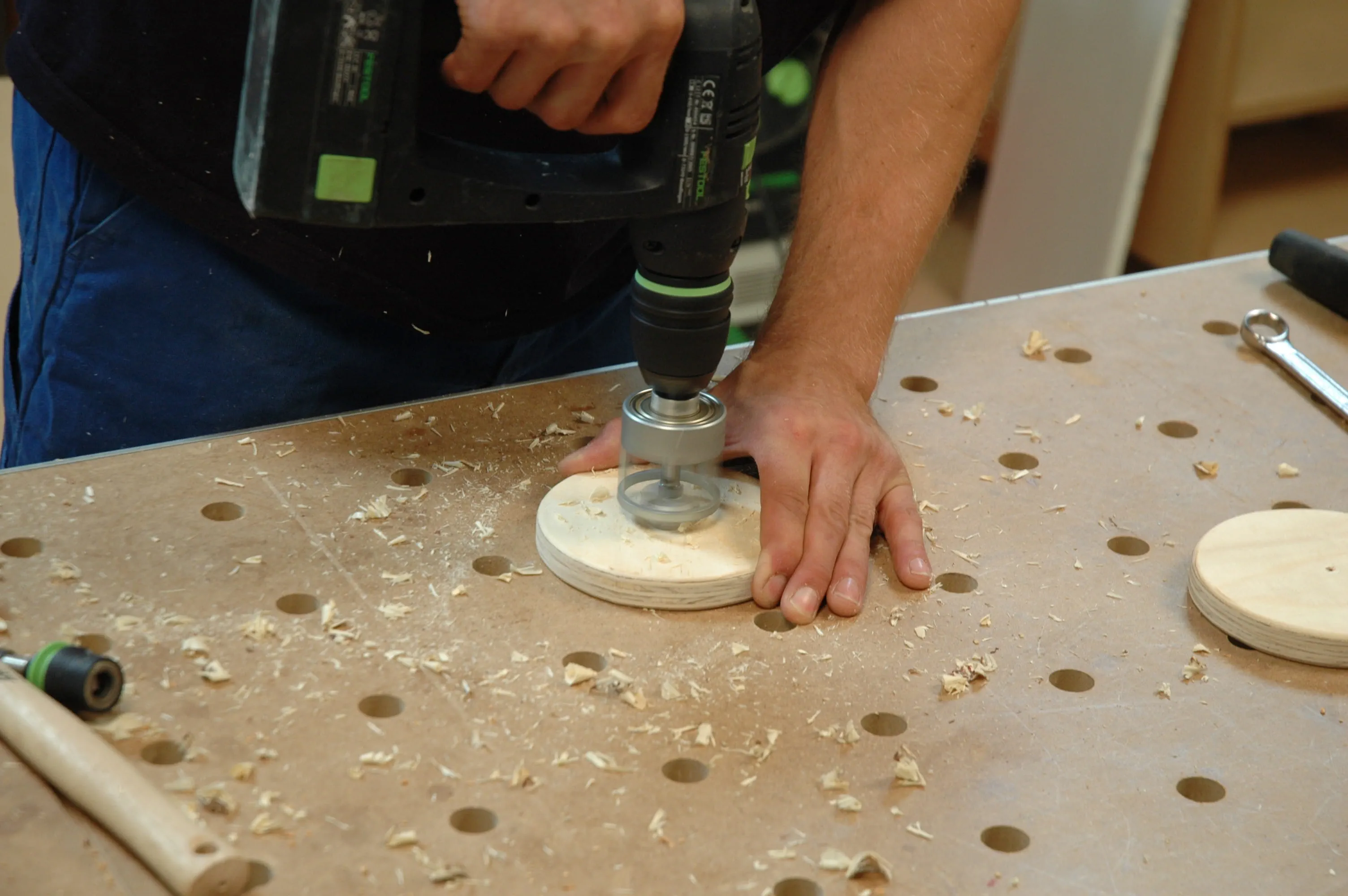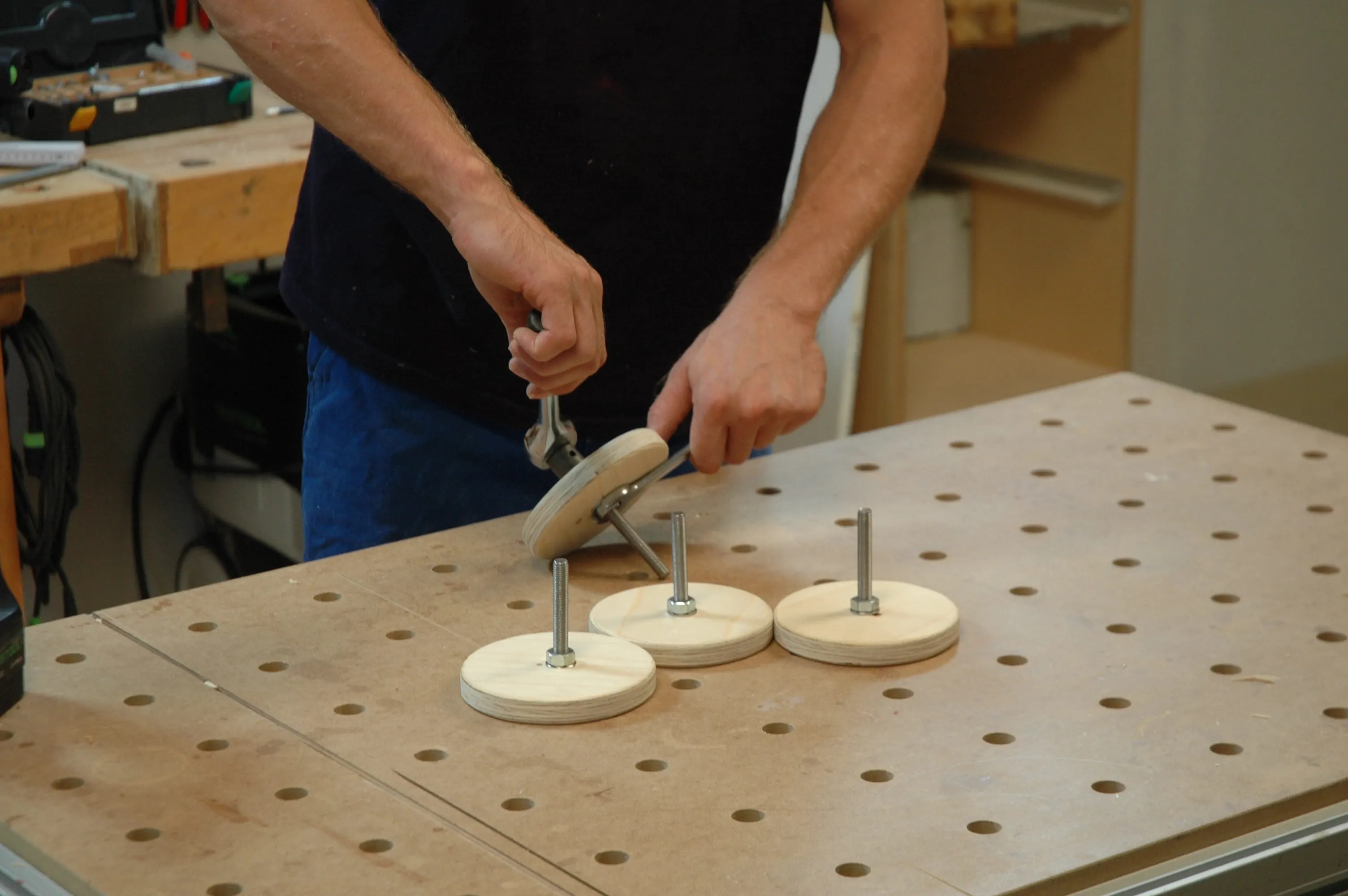 Für die einstellbaren Füße werden runde Scheiben (Pos. 16) aus Sperrholz mit einer Stichsäge ausgeschnitten. Brechen (entgraten) Sie die Kanten mit einem Handschleifklotz. Auf der Unterseite der Scheiben werden 30 mm Löcher gebohrt, die Bohrtiefe entspricht dem Kopf der Maschinenschraube (M 10 x 80) und einer Beilagscheibe.