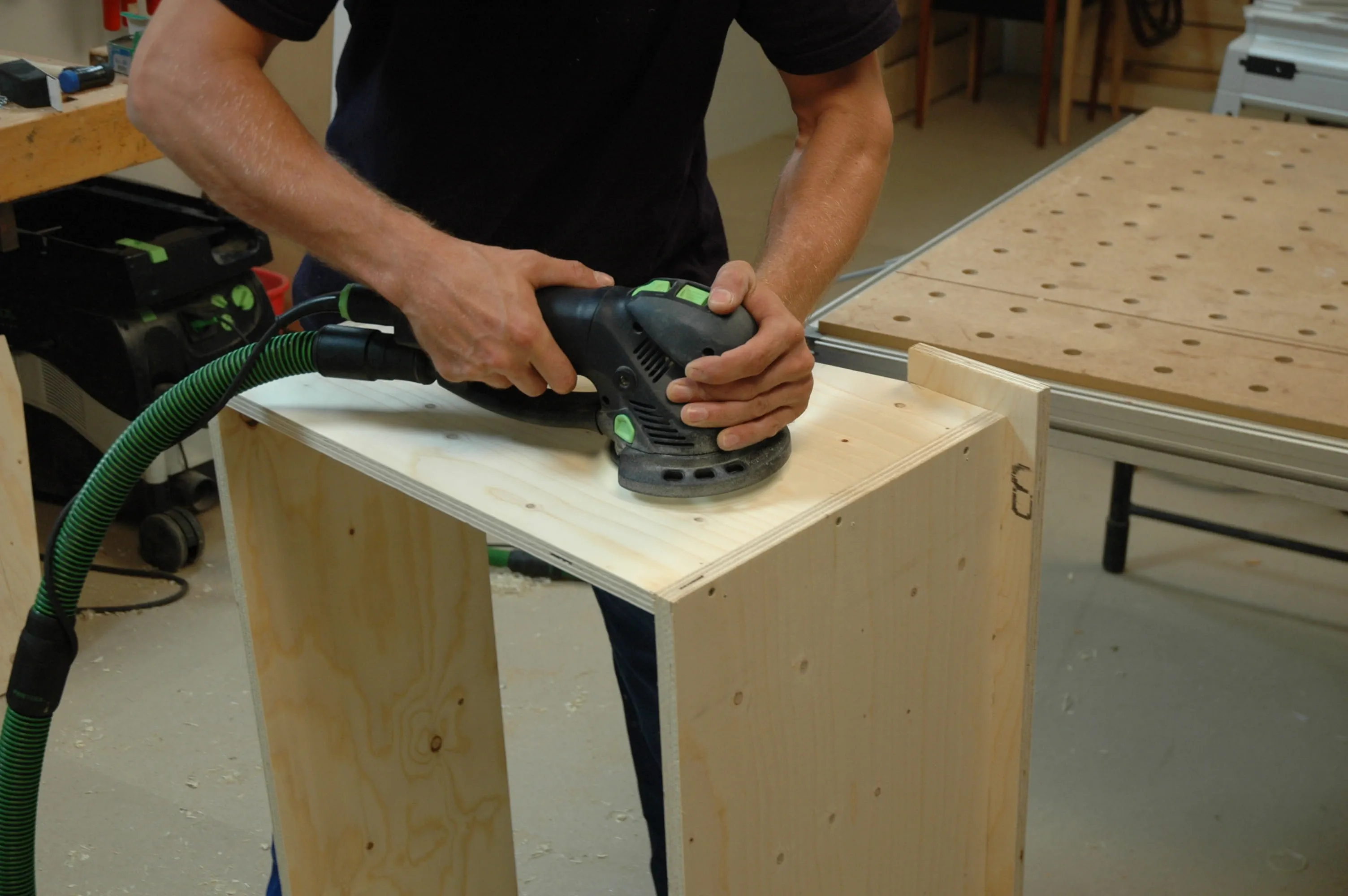 Nachdem der Kleber im Rahmen getrocknet ist, werden die Zwingen gelöst und die Verbindungen mit einem Exzenterschleifer und Schleifpapier Körnung P 120 eben geschliffen.