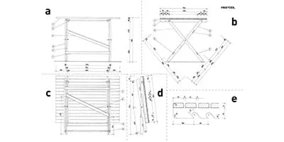 Die Verbindungen am Untergestell sind so genannte Überplattungen. Das heißt, man arbeitet auf jedem Brett die halbe Materialdicke aus und steckt am Schluss beide Teile zusammen. Zeichnen Sie die genauen Positionen dieser Verbindungen auf den Beinen (Pos. 3 + 4) und auf den Streben (Pos. 5, 6 + 7) an.