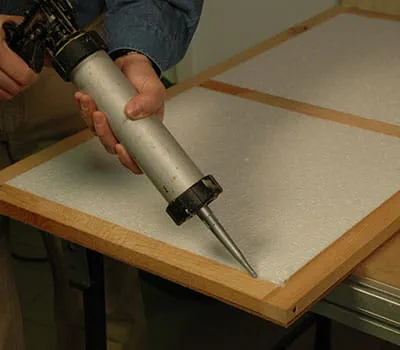 Wenn alle Innenplatten und die Boden‑platte (Pos. 1) verschraubt sind, schneiden Sie die Styropordämmung zu und legen die Platten in die Felder ein. Zeichnen Sie die Positionen der Unterkonstruktion auf den Außenverkleidungen (Pos. 6, 12) an. Diese werden mit dem Rest der Wand verklebt (PU‑Kleber). Nun werden die Einzelteile der Wand mit Zwingen verspannt.