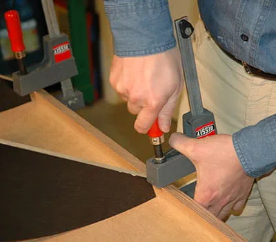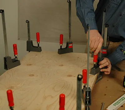 Die Unterkonstruktion mit Druck auf der Verkleidung abrollen und zunächst in der Mitte, dann an der zweiten Abschlussleiste, mit Zwingen fixieren. Um ein gutes Ergebnis zu erzielen, werden so viele Zwingen wie möglich gesetzt. Falls nach dem Trocken noch Spalten zu erkennen sind, diese im Inneren des Daches mit Silikon abdichten.