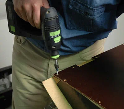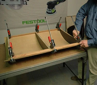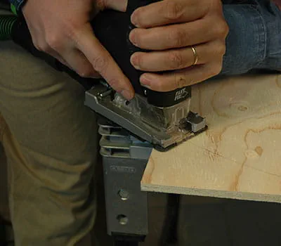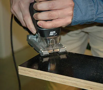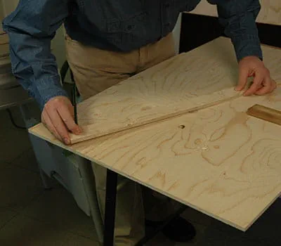 Lassen Sie sich die Sperrholzplatten nach den Angaben in der Materialliste zuschneiden. Wenn Sie die Einzelplatten selbst zuschneiden wollen, ist es am einfachsten, Latten als Unterlagen auf den Boden zu legen und dann mit einer Tauchsäge und einer Führungsschiene die Platten zuzuschneiden. Es hat sich gezeigt, dass es sinnvoll ist, mit dem Bau der beiden Seitenwände und des