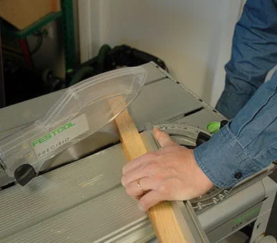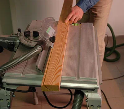 Um eine genaue Schnittkante zu erhalten, den Pendelhub der Stichsäge auf Stellung 1 einstellen. Schneiden Sie mit der Tischkreissäge die Dachabschlussleisten der Länge nach schräg zu. Bei Längsschnitten in Massivholz ist es dringend erforderlich, ein grobes Sägeblatt zu verwenden. Schneiden Sie die Länge der Leisten mit der Tischkreissäge ab.