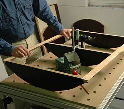 Zeichnen Sie die Breite der Abschluss‑leisten auf den Dachträgern an und schneiden die Ecken mit der Tischkreis‑säge ab. Die Verbindungslöcher für die Schrauben zwischen den Abschlussleisten und Rippen anzeichnen und die Löcher (D = 4 mm) bohren. Die Träger und die Abschlussleisten miteinander verschrauben. Die Dachträger und die Dachaußenverkleidung werden miteinander verklebt.