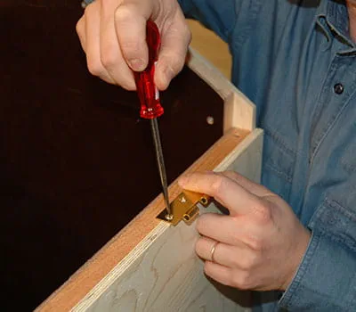 Wenn nun das Dach aufgelegt und ausgerichtet ist, die Position der Scharniere anzeichnen. Markieren Sie die Außenseite der Wand auf der Unterkante der Scharniere mit einem Spitzbohrer. Das Dach wieder abnehmen und die Scharniere festschrauben. Jetzt kann die komplette Hütte montiert werden und alle Kanten und Ecken nachgeschliffen werden. Zerlegen Sie die Hütte wieder und schleifen mit einem Exzenterschleifer alle Außenflächen.
