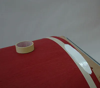 Um später die genaue Positionierung zu erleichtern, ist es wichtig, dass Sie den Dachüberstand anzeichnen. Zum Verkleben benutzen wir wieder PU‑Kleber. In diesem Arbeitsschritt müssen Sie mit zwei Personen arbeiten. Es ist auch ratsam, das Ganze vorher “trocken” (ohne Kleber) durchzuspielen. Geben Sie den Kleber auf den Dachträgern an und fixieren Sie die Verkleidung an der einen Außenkante.