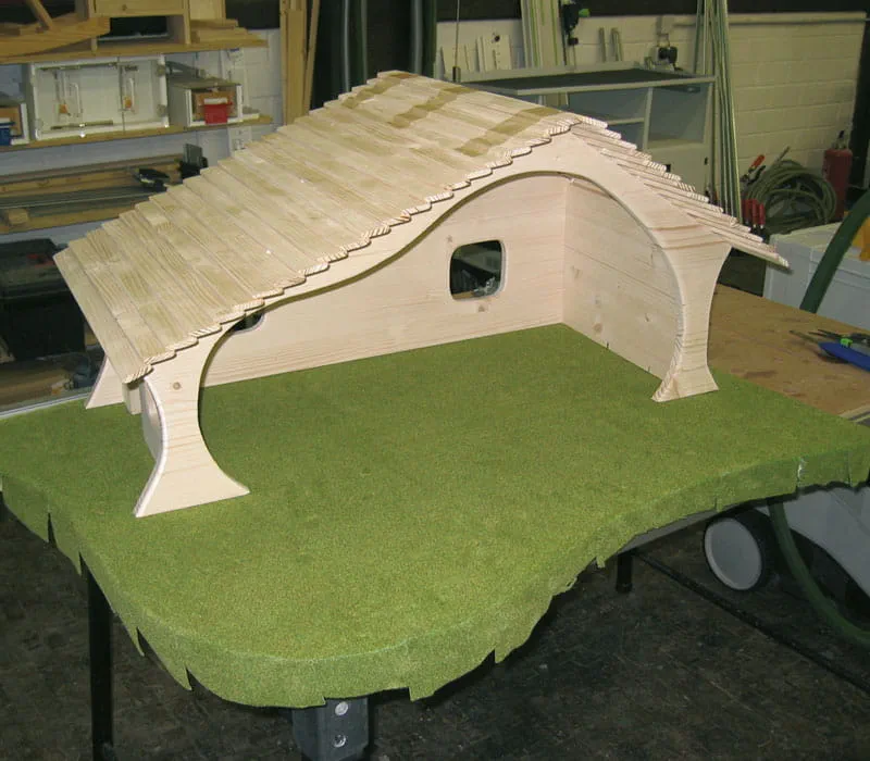 Während der Leim trocknet, die Dachleisten (Meterware im Holzhandel) fürs Dach auf Länge schneiden und die Kanten brechen.